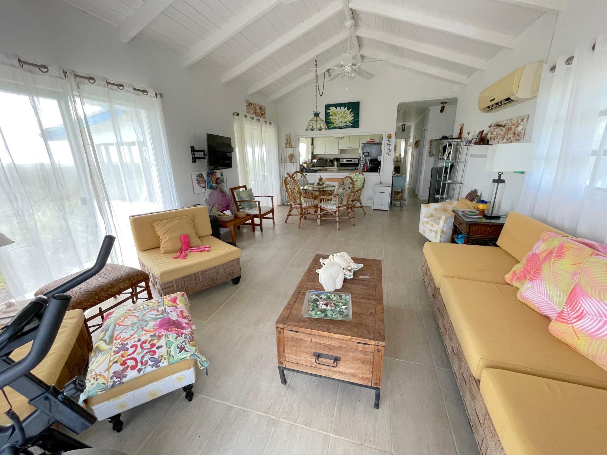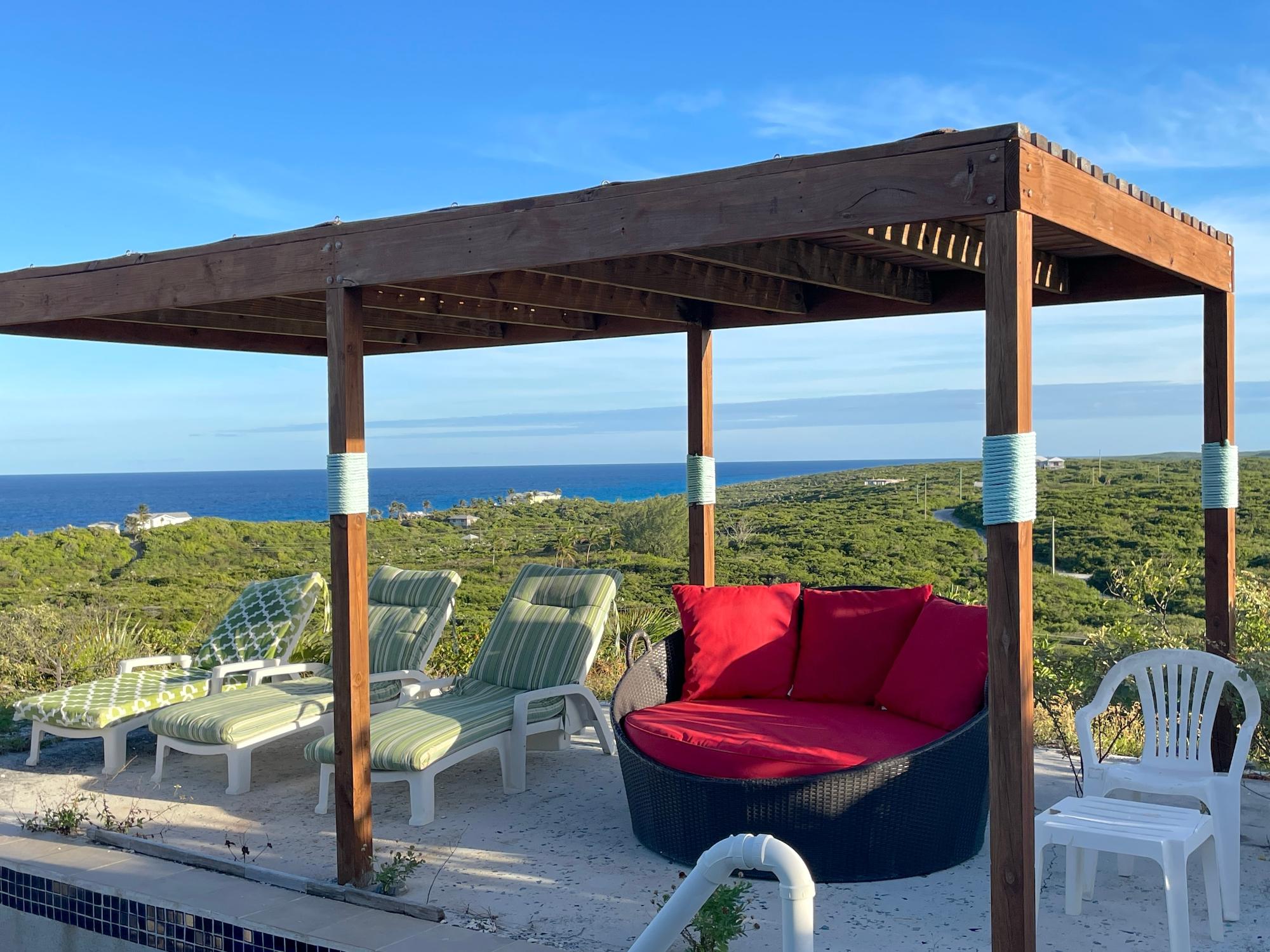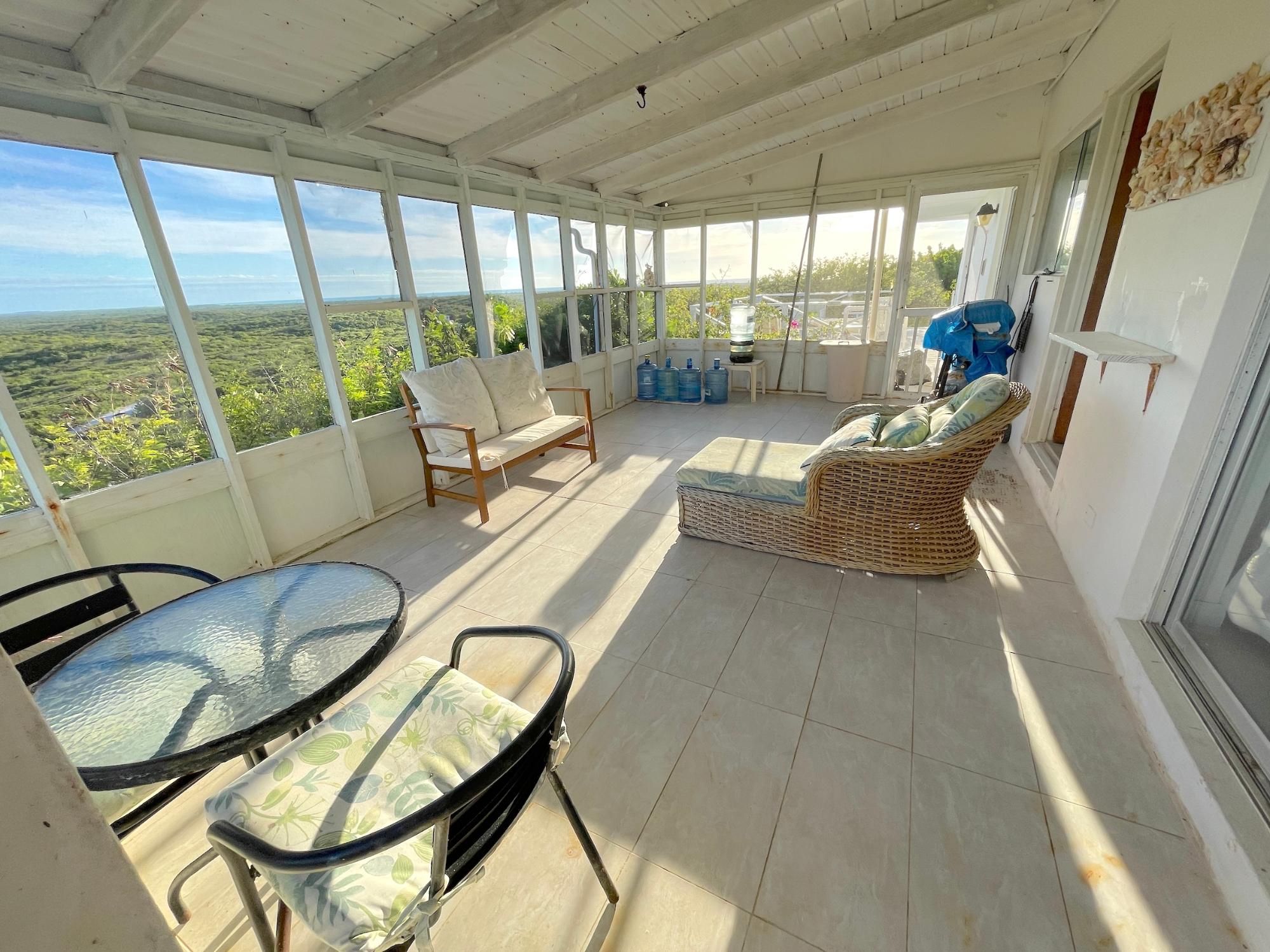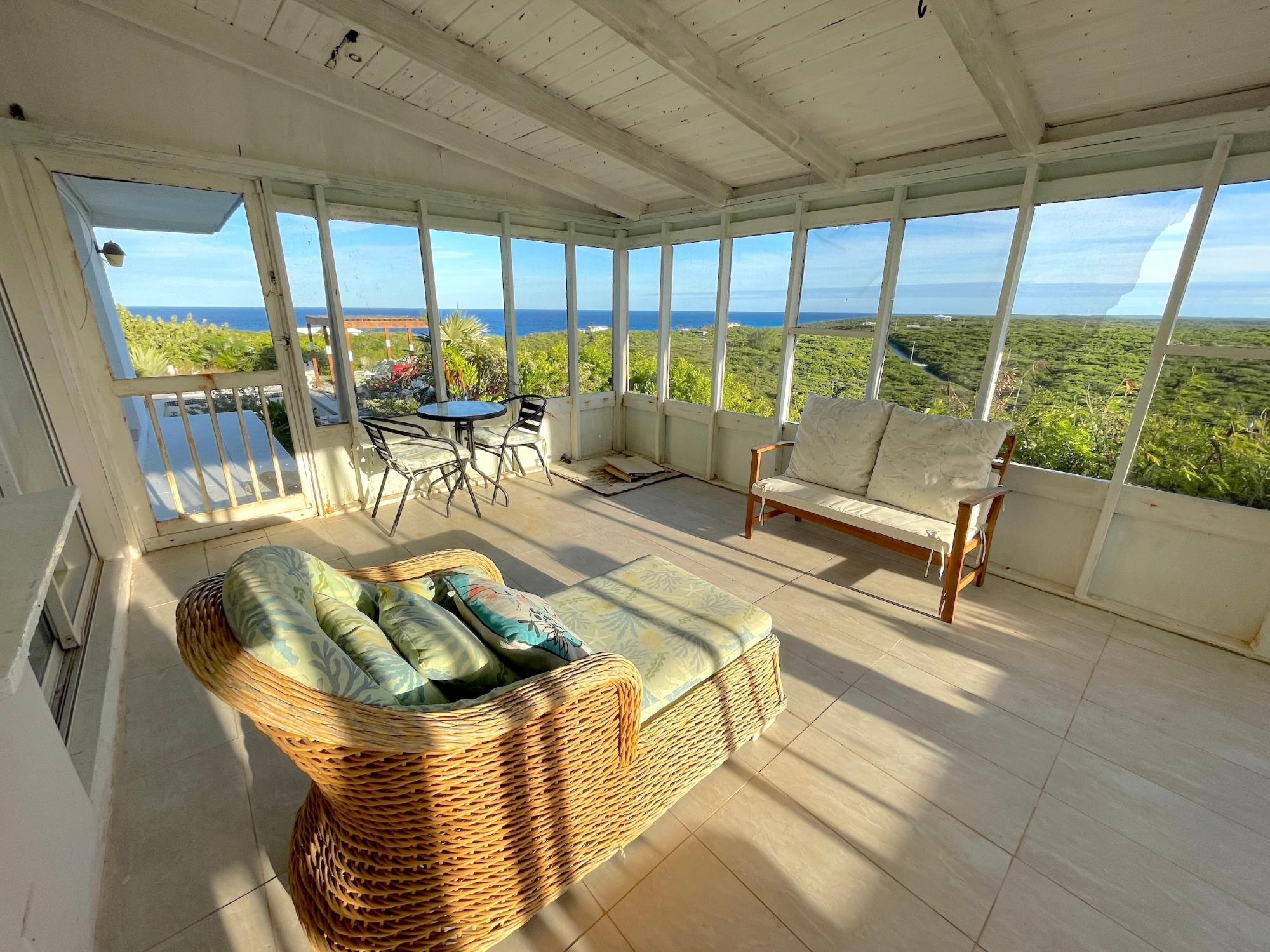 2 Bedroom/1 bath with 1 car garage and pool. 120 ft. above sea level with sprawling views of the Atlantic Ocean and Bahama Bank - sunset and sunrise. Located in the resort community of Stella Maris where residents enjoy the resort amenities, including restaurants and pool bar and grill. Enjoy a dip in the pool while watching the sunrise or just sip on a cup of coffee and take in the views. The home is being sold furnished. The 3rd room can be converted into a second bathroom. 30,000 gallon water supply. Concrete construction. Tiles throughou. 3 rainwater cisterns. Pool - 12x14x7 feet (depth) 2 patios without screens 1 covered patio. Pergola by the pool. A/C units in all rooms. Bathroom recently renovated and has direct views to the outdoor scenery. Large primary bedroom which opens on to the deck.