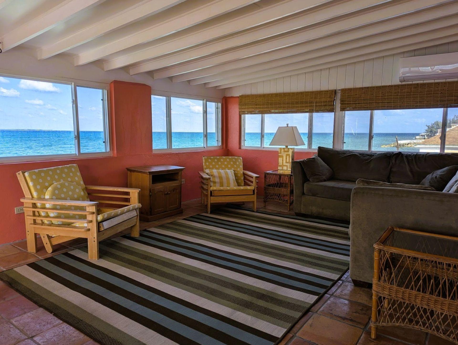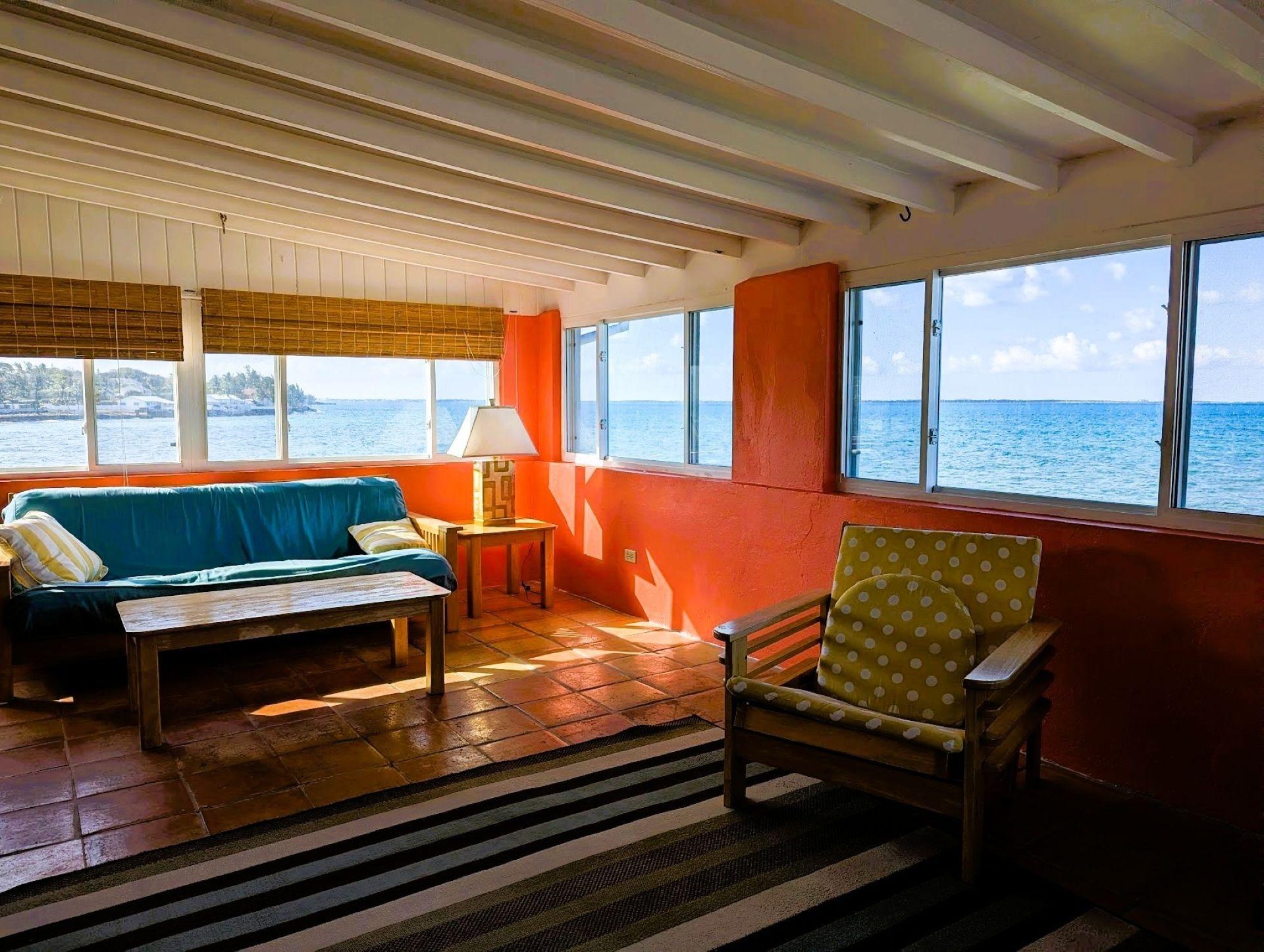 This spacious, fully furnished, 2-bedroom, 2nd-floor waterfront apartment is located in a quiet neighborhood on Eastern Road. Includes two balconies, one on each side, and a Bahama room with panoramic views of the sea overlooking Rose & Athol Islands. The apartment has a private gated entrance and has easy access to the sea via seaside steps. It includes a standby generator and laundry access. Call for a private viewing.