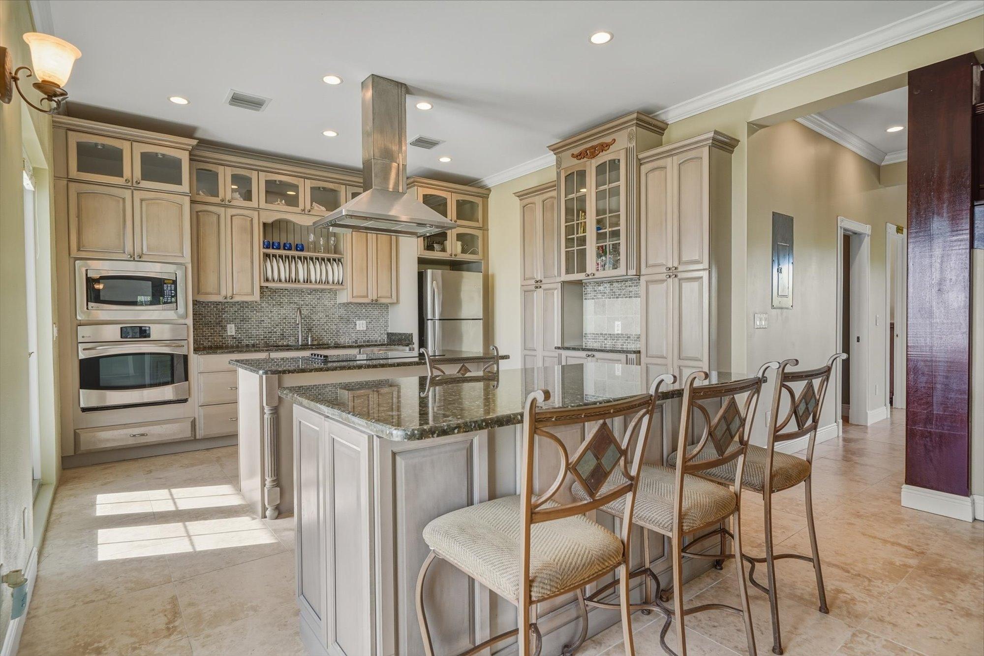 Rare three-story beachfront estate set on approximately two acres of direct Atlantic Ocean frontage in Bahama Palm Shores. This expansive residence offers five bedrooms, five and a half bathrooms, and panoramic ocean views from nearly every room. Designed for relaxed island living and entertaining, the home features open-concept living and dining areas filled with natural light and ocean vistas. The centrally located designer kitchen features dual islands and granite countertops, ideal for hosting and everyday living. Two guest bedrooms with ensuite bathrooms and direct access to a wraparound covered deck are located on the main living level. The lower level includes two additional bedrooms connected by a Jack-and-Jill bathroom, a large laundry room, and a spacious two-car garage with ample storage. The third floor is dedicated entirely to the primary suite, offering exceptional privacy, sweeping ocean views, and direct access to the wraparound deck. Outdoor amenities include a 20â x 30â solar-heated swimming pool, direct beach access via tropical footpath, and expansive covered deck