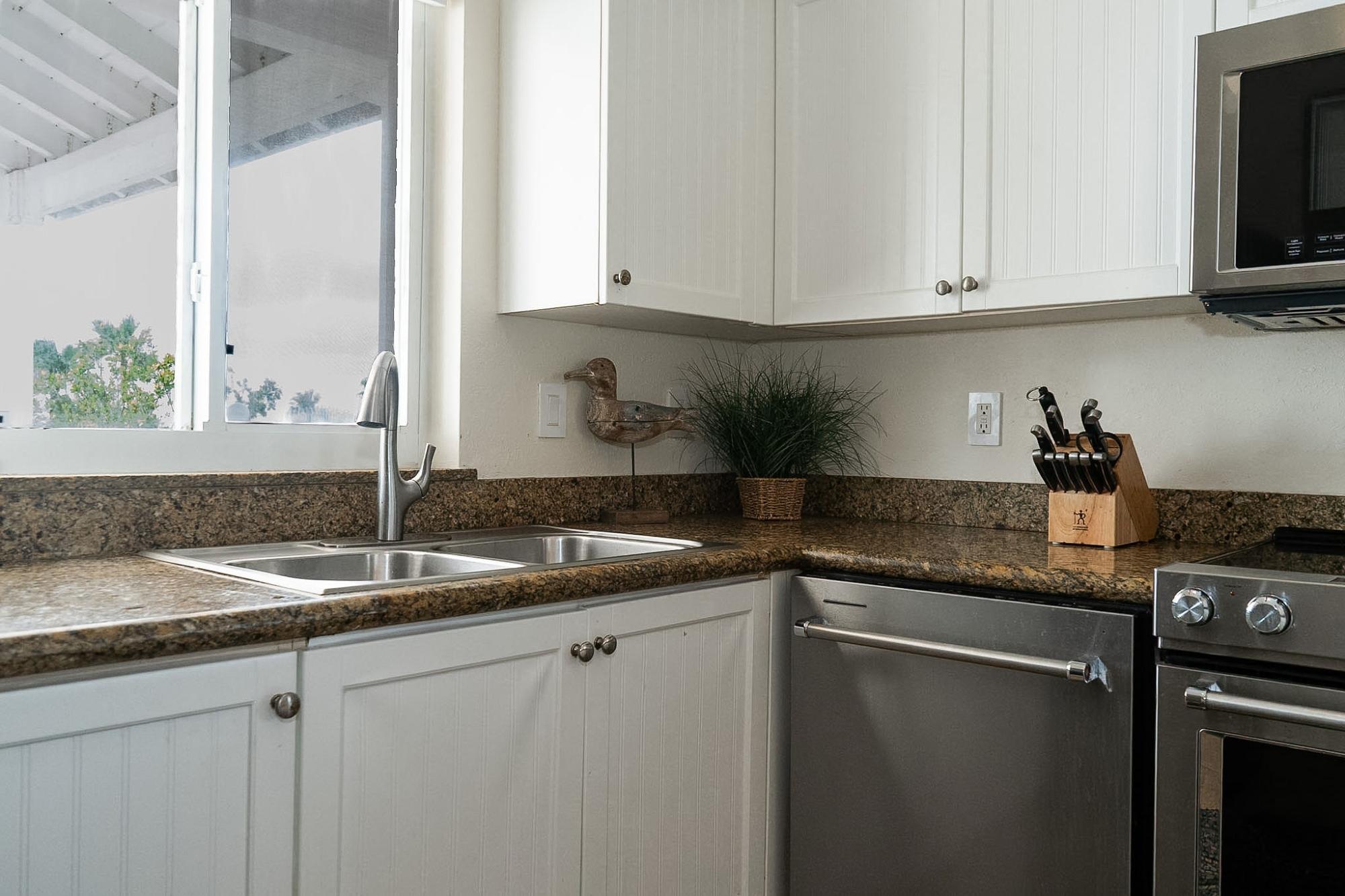 This spacious third-floor unit features an open-concept layout with generous living and dining areas, enhanced by abundant natural light and soaring ceilings. The extended private balcony is accessible from both the living room and primary bedroom, creating the perfect indoor-outdoor flow for relaxing or entertaining. The residence is offered fully furnished with sleek, modern décor and a well-equipped kitchen featuring granite countertops, updated KitchenAid stainless-steel appliances, an electric stove, refrigerator, microwave, and a washer/dryer combination. The inviting living room includes a pull-out sofa, seating for three, and a flat-screen television, while the dining area comfortably accommodates everyday meals or guests.