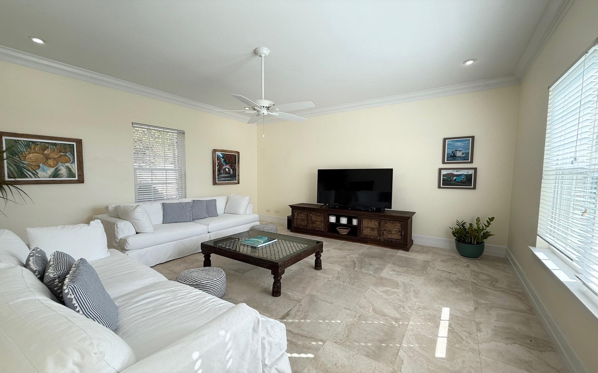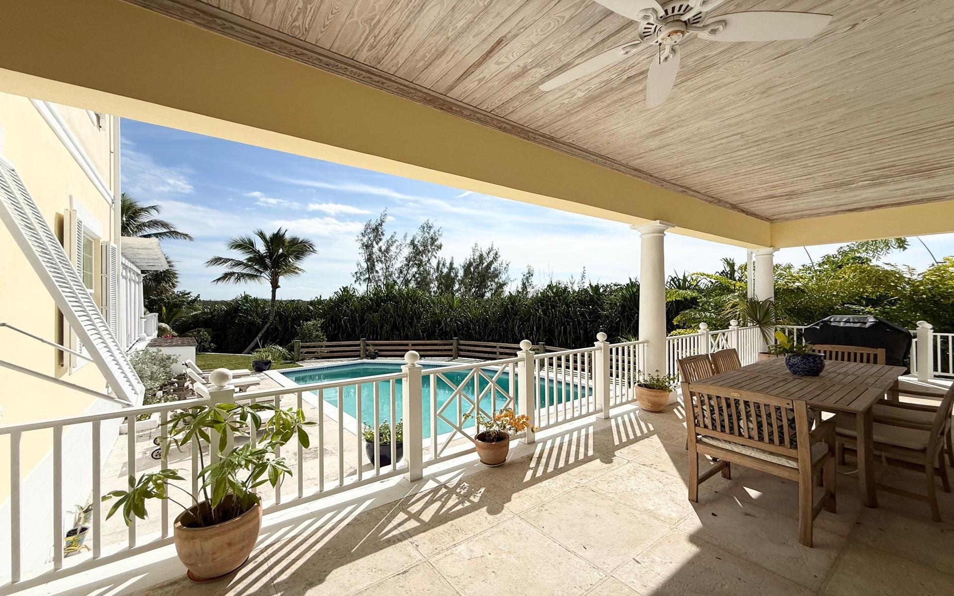 Situated on Christie Terrace within the gated community of Lyford Cay, this home sits on a 1/3 acre of landscaped grounds. The property is along the ridge, looking south, with treetop vistas. The 3,800 sq. ft. main residence features a spacious living room with a built-in bar, which leads to a 600 sq. ft. poolside veranda. There is a dining room with sliding glass doors opening onto the garden. The cozy family room has a pass-through to the kitchen, which has been refreshed and includes the standard kitchen appliances. It also benefits from granite countertops and a breakfast bar. The kitchen also opens onto the poolside veranda, ideal for casual outdoor living and dining. There is also a powder room on the ground floor. Upstairs, there are three bedrooms, all with walk-in closets and ensuite baths. The primary bedroom has a large walk-in closet and a private veranda overlooking the pool and garden. The primary bathroom enjoys a relaxing soaking tub, a separate shower, and double sinks. There is also a laundry room upstairs by the bedrooms for convenience.