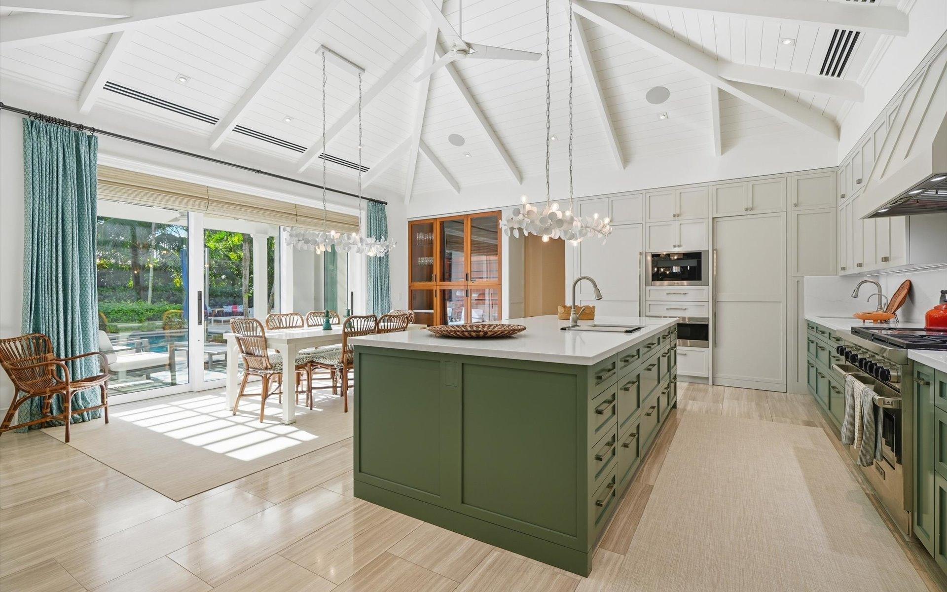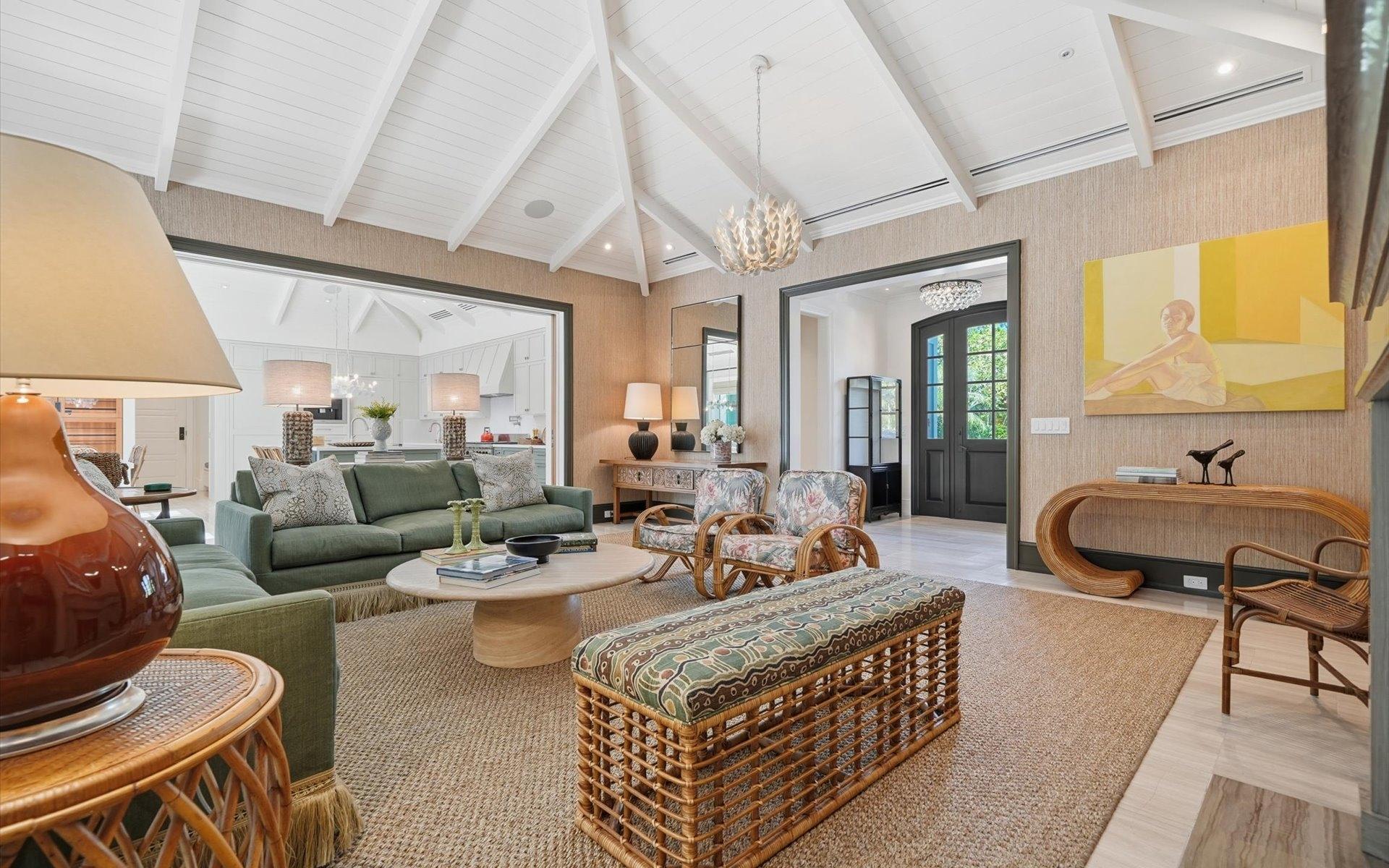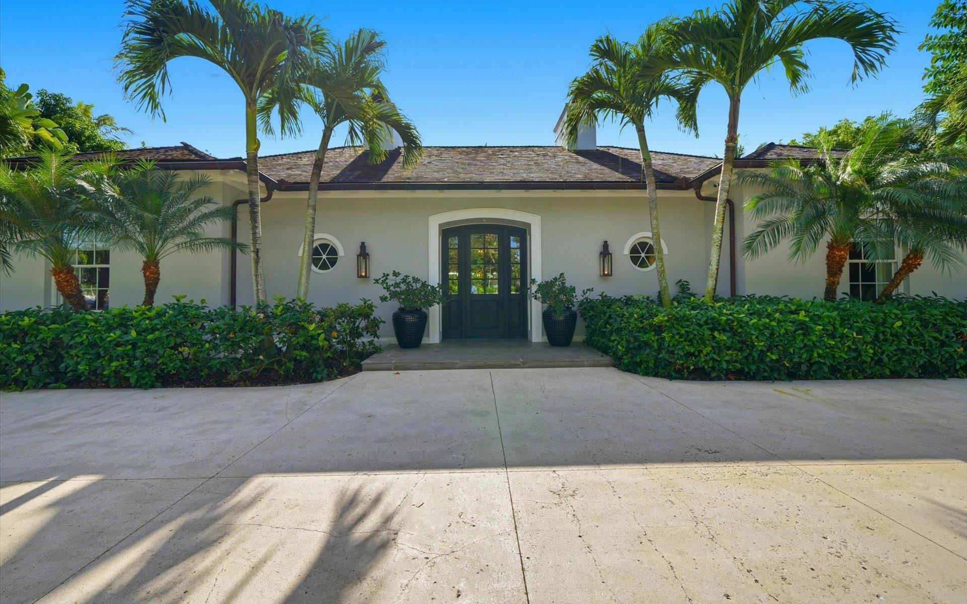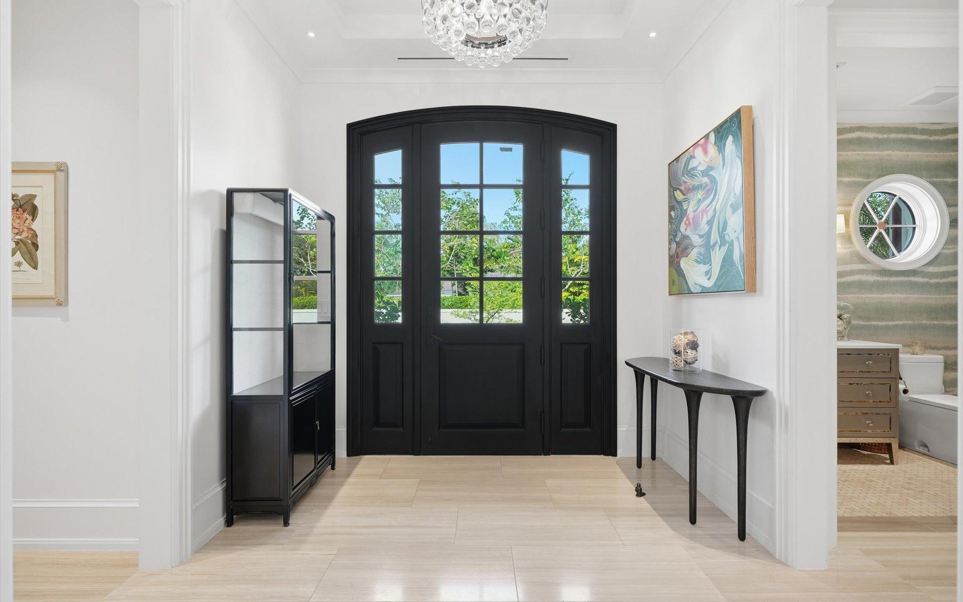 Carlea House is a beautifully renovated four-bedroom residence situated on Chelsea Place in the prestigious Lyford Cay community. The 5,214 sq ft home sits on 0.55 acres. Built by E.P Taylor and designed by John Volk, it was home to the original manager of the Lyford Cay Club. Although the home underwent a complete modern, custom renovation in 2019, the original front wall façade and the classic Lyford Cay rooflines preserve the charm. At the front of the house, one is greeted by six Hong Kong orchid trees, spaced along the street easement. Many of the palm trees were original to the property and preserved during construction, then replanted to maximize the new layout. The mature and extensive landscaping includes the original rubber trees flanking the east and west boundary and over 100 palm trees providing an oasis of privacy in the rear of the property and a sense of belonging from the street. As you enter Carlea House, you are greeted by a grand mahogany door and are invited into the foyer, illuminated by the glass pearl chandelier.