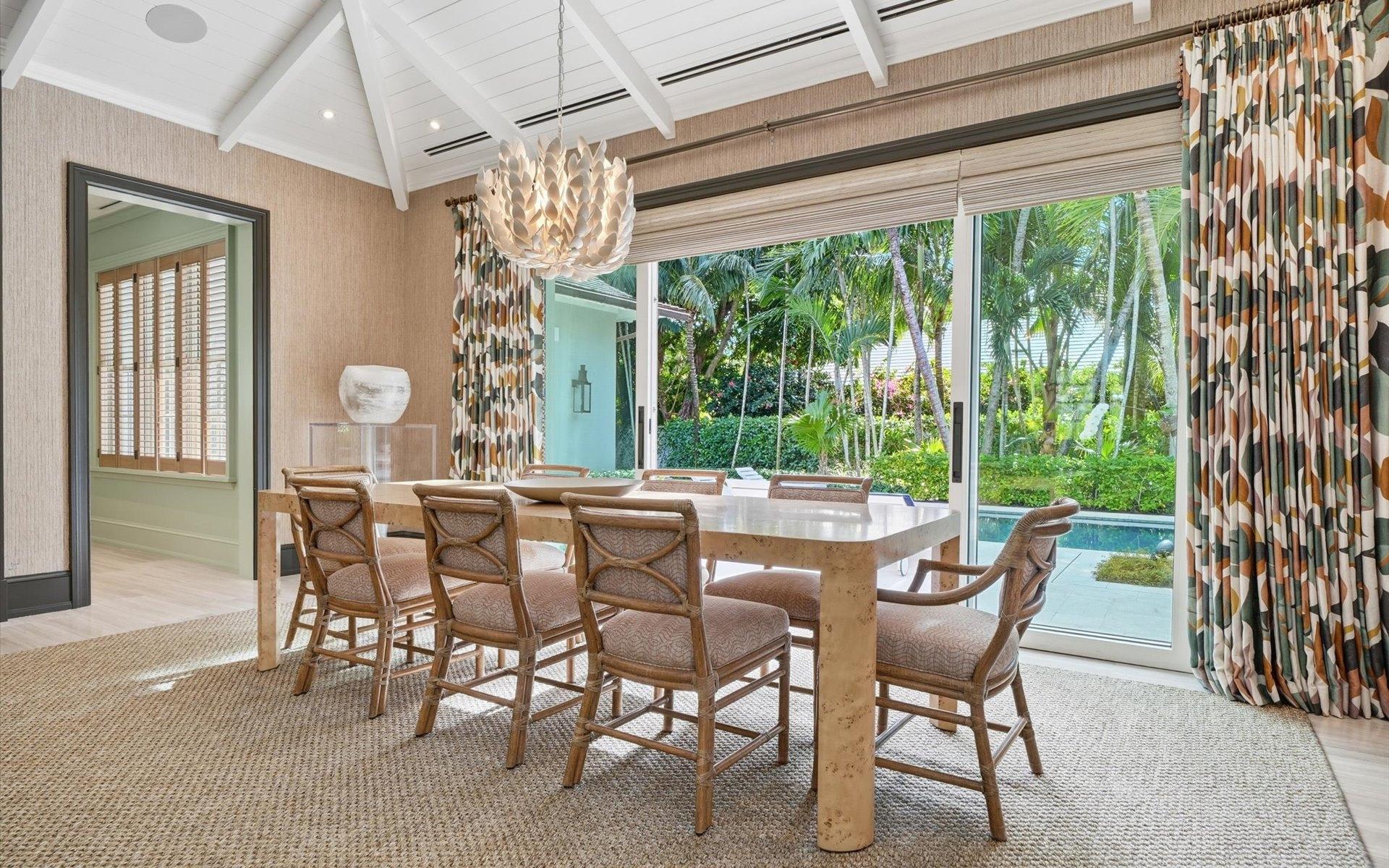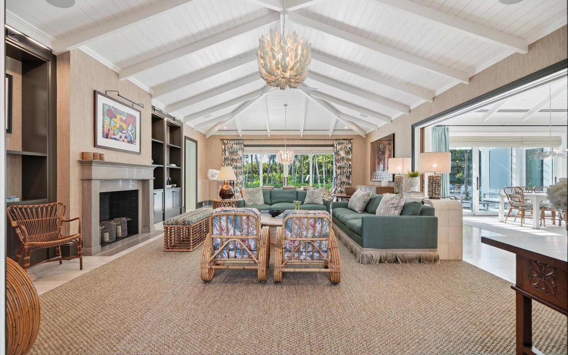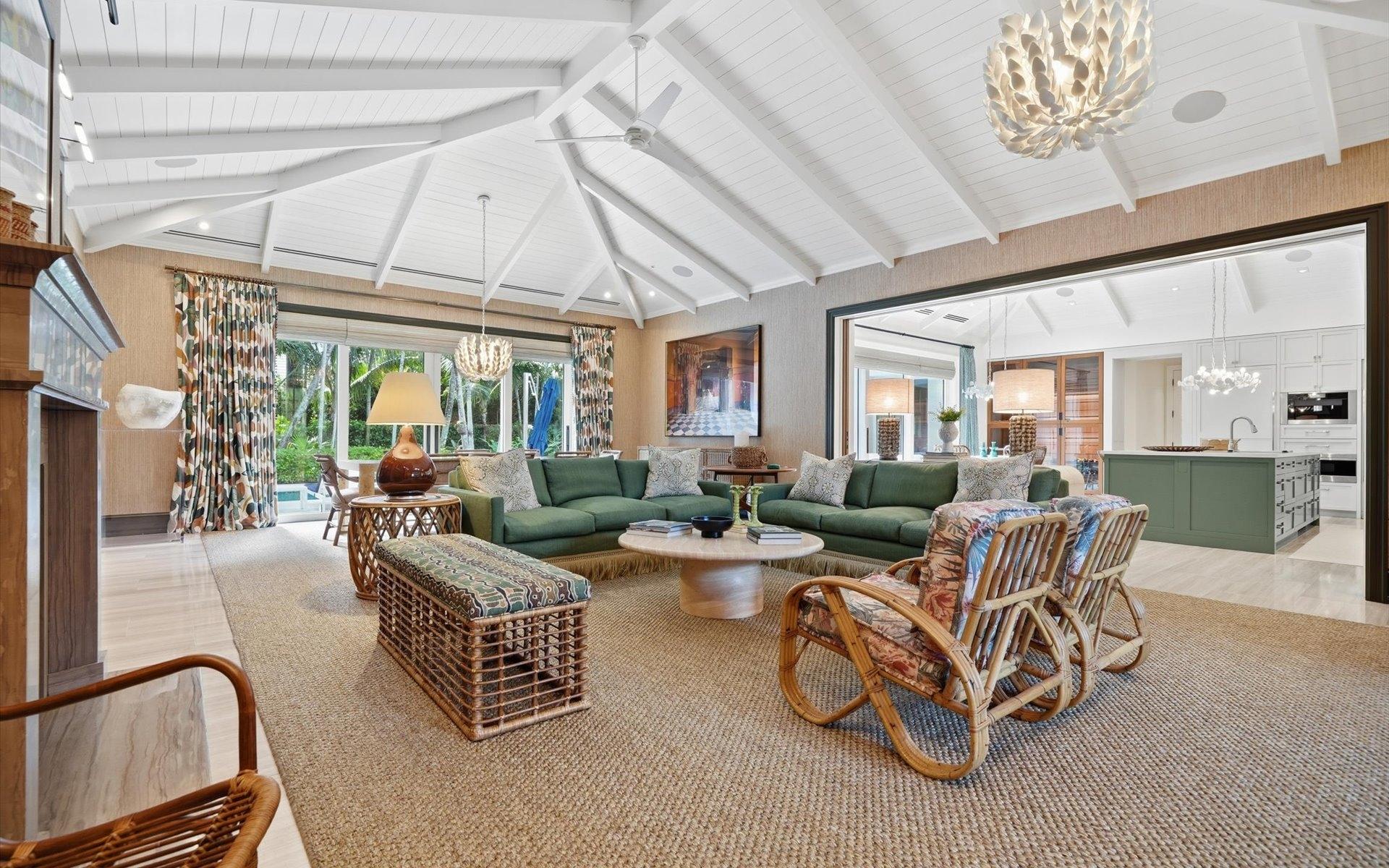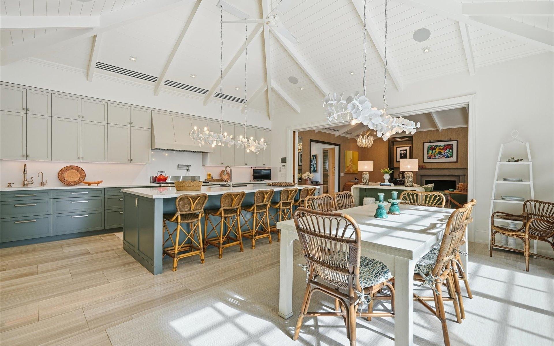 Carlea House is a beautifully renovated four-bedroom residence situated on Chelsea Place in the prestigious Lyford Cay community. The 5,214 sq ft home sits on 0.55 acres. Built by E.P Taylor and designed by John Volk, it was home to the original manager of the Lyford Cay Club. Although the home underwent a complete modern, custom renovation in 2019, the original front wall façade and the classic Lyford Cay rooflines preserve the charm. At the front of the house, one is greeted by six Hong Kong orchid trees, spaced along the street easement. Many of the palm trees were original to the property and preserved during construction, then replanted to maximize the new layout. The mature and extensive landscaping includes the original rubber trees flanking the east and west boundary and over 100 palm trees providing an oasis of privacy in the rear of the property and a sense of belonging from the street. As you enter Carlea House, you are greeted by a grand mahogany door and are invited into the foyer, illuminated by the glass pearl chandelier.