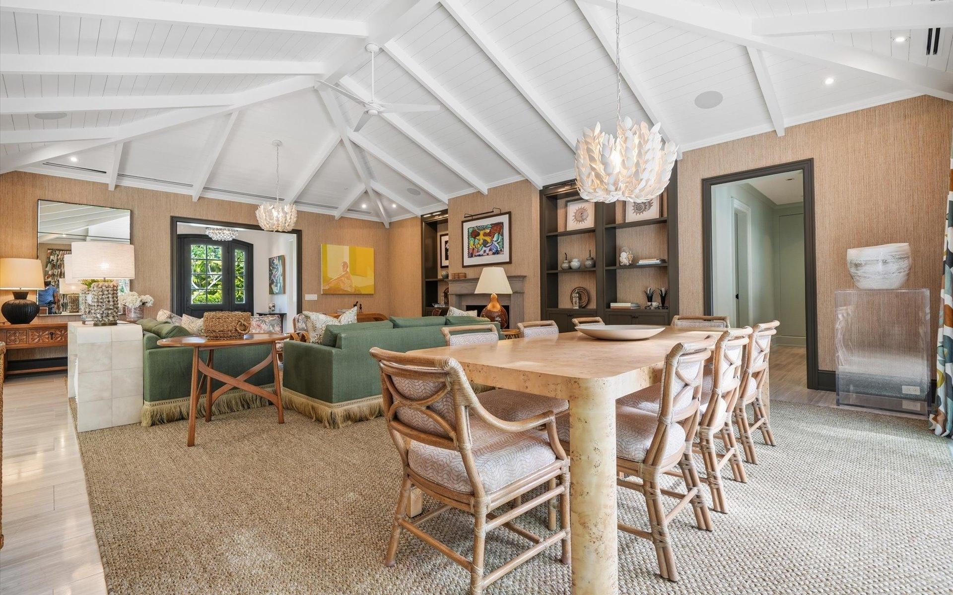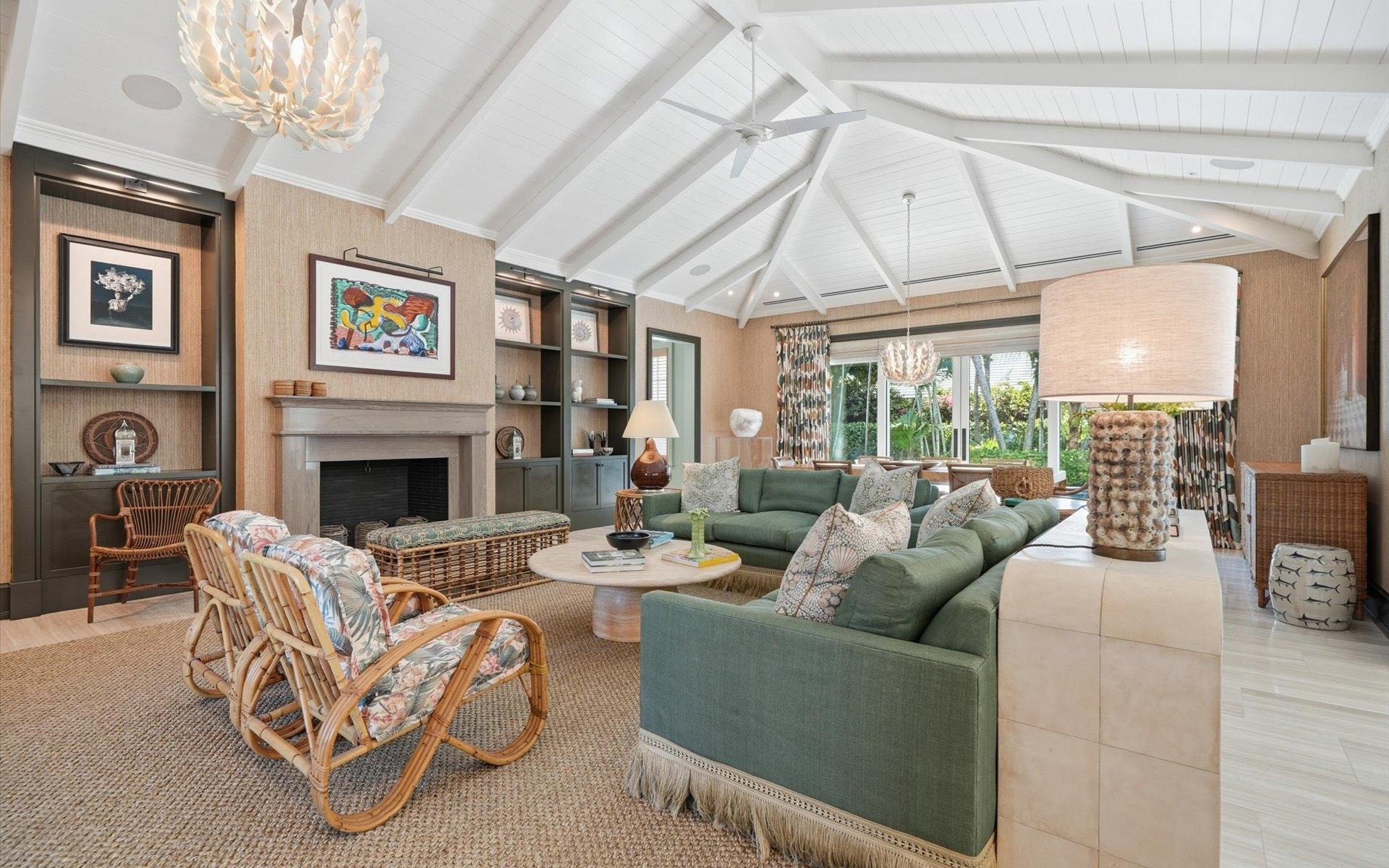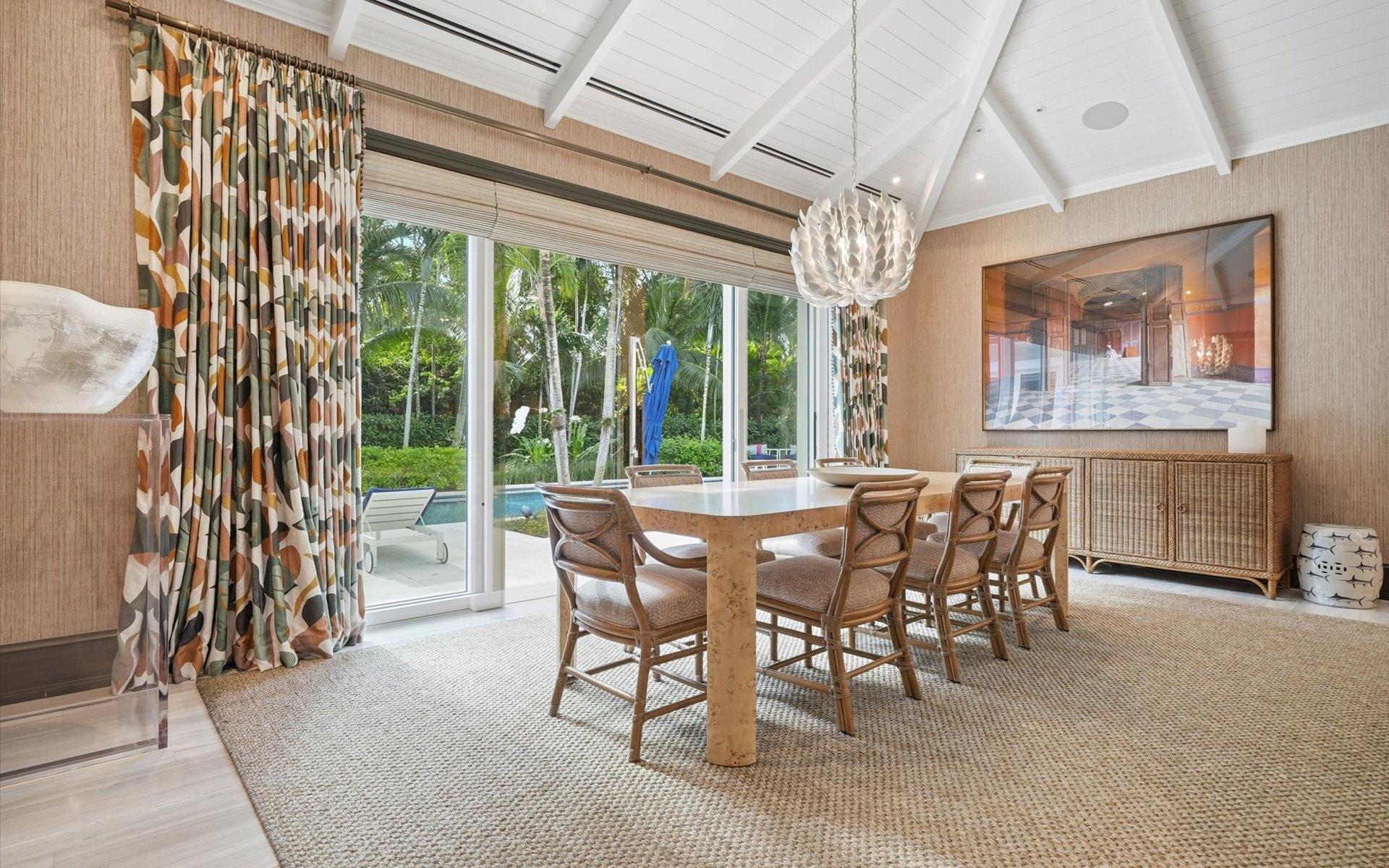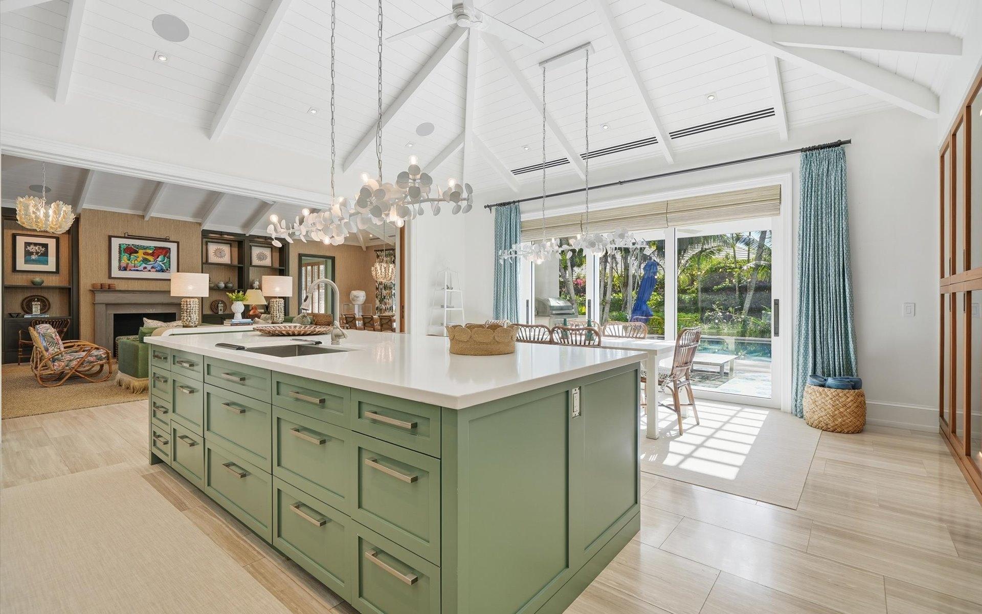 Carlea House is a beautifully renovated four-bedroom residence situated on Chelsea Place in the prestigious Lyford Cay community. The 5,214 sq ft home sits on 0.55 acres. Built by E.P Taylor and designed by John Volk, it was home to the original manager of the Lyford Cay Club. Although the home underwent a complete modern, custom renovation in 2019, the original front wall façade and the classic Lyford Cay rooflines preserve the charm. At the front of the house, one is greeted by six Hong Kong orchid trees, spaced along the street easement. Many of the palm trees were original to the property and preserved during construction, then replanted to maximize the new layout. The mature and extensive landscaping includes the original rubber trees flanking the east and west boundary and over 100 palm trees providing an oasis of privacy in the rear of the property and a sense of belonging from the street. As you enter Carlea House, you are greeted by a grand mahogany door and are invited into the foyer, illuminated by the glass pearl chandelier.