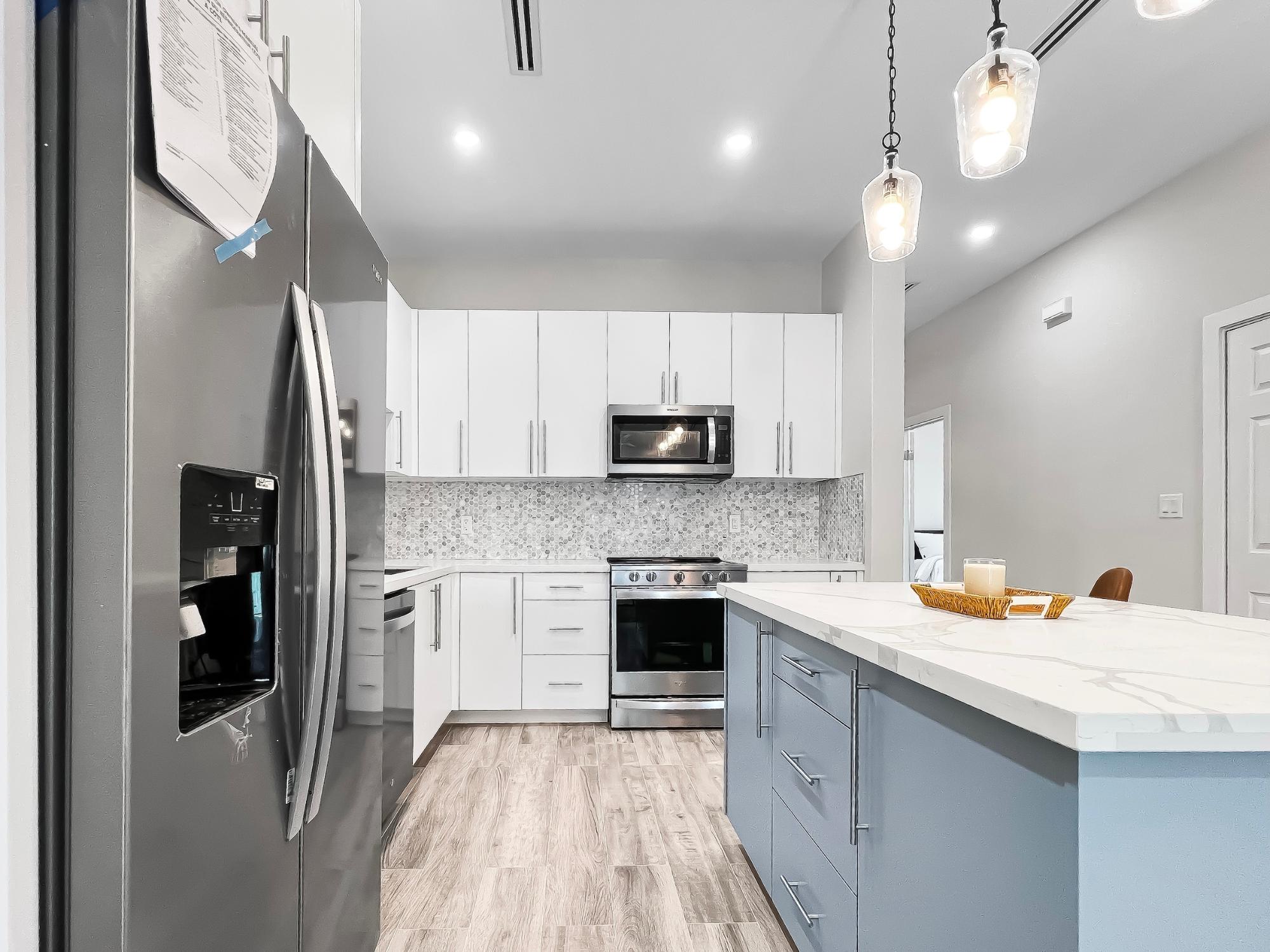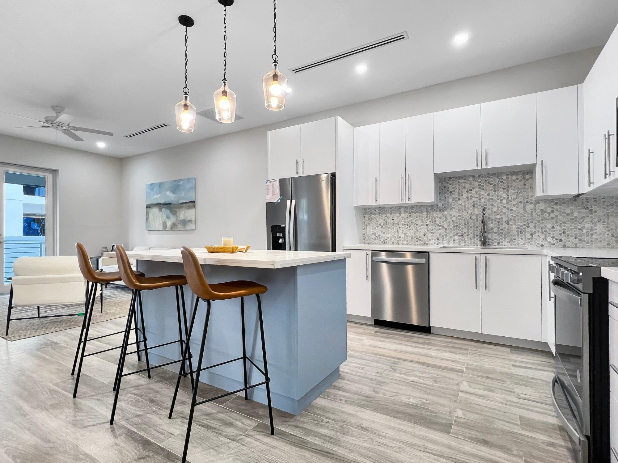 This brand-new rental, just steps away from the iconic The Islands "Caves" and a pristine stretch of white sandy beachfront, is now available for rent. Offered fully furnished, the unit is located within the gated community of Caves Terrace, a section of the increasingly popular Westlake Plantation community. From the moment you walk through the impressive 8-foot entryway, you are welcomed into a contemporary interior featuring high ceilings and stylish modern accents. Each room is thoughtfully designed with generous space, built-in closets with shelving, and an abundance of natural light. The guest bedroom features a contemporary queen bed, while the primary suite offers a king bed, a spacious walk-in closet, and a well-appointed bathroom with dual vanities and a frameless glass walk-in shower. The primary bedroom also features tall impact doors that open onto the patio, creating approximately 250 sq. ft. of outdoor living space. With an additional seven units available for rent within the same complex, this property is an excellent option for companies or organizations