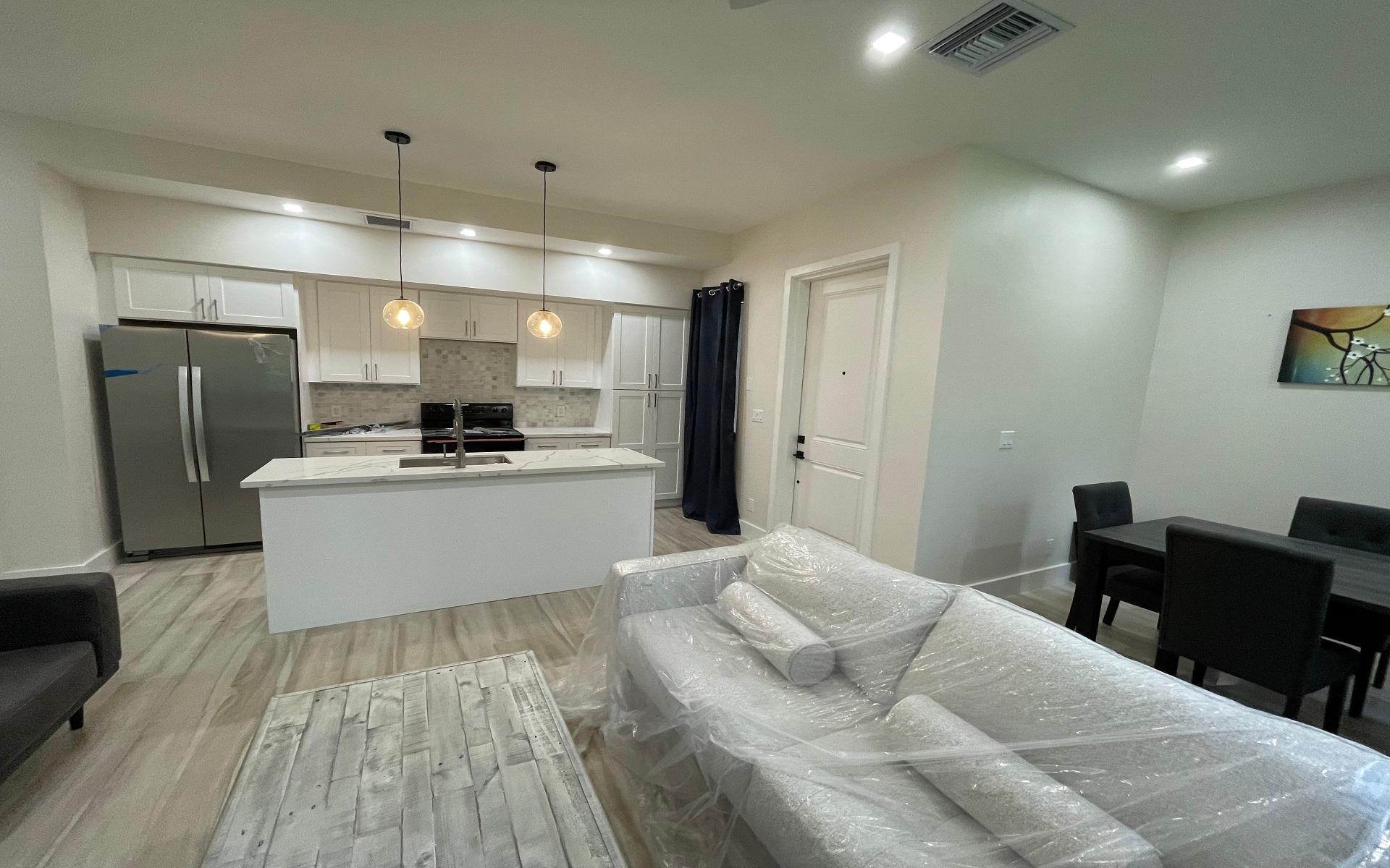 This one-bedroom, one-bath new apartment in Coconut Cove, located on Atlantic Drive, is ready to rent from January 5, 2026. We are looking for an annual lease, or a 6 month minimum term. The apartment is located in a brand-new gated community with security cameras and a pool, as well as a clubhouse. This ground-floor apartment is privately tucked away and overlooks a grassy area and a green space next door. Brand-new, high-quality furnishings, including a large-screen TV and a chic quartz open kitchen, make this apartment a soothing and calm space. In fact, we haven't had time to make the bed and remove all the plastic from the furniture yet. This open apartment features high ceilings and a spacious bedroom, as well as a separate bathroom. The bedroom has brand-new furniture, and the closet has been finished with an organization unit, which means lots of room for your clothes. Your very own washer and dryer are tucked away in the hallway closet, next to a place for extra storage and a linen closet. What's not to like?