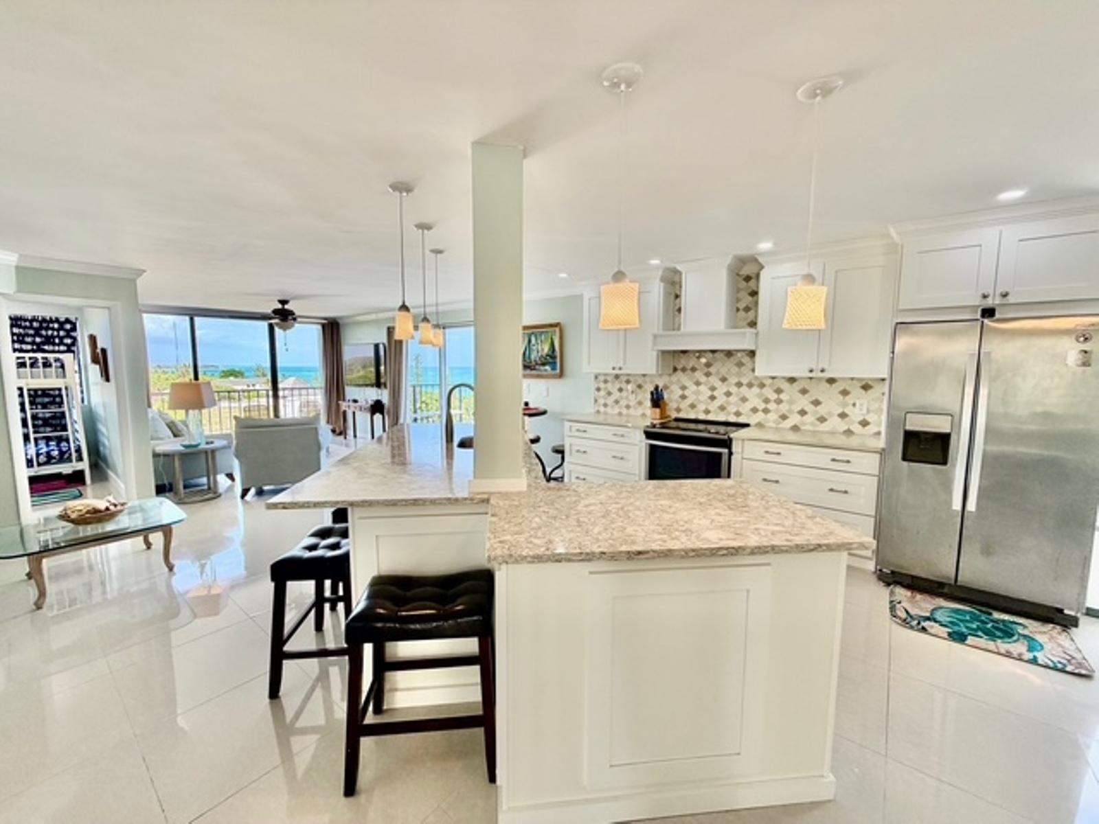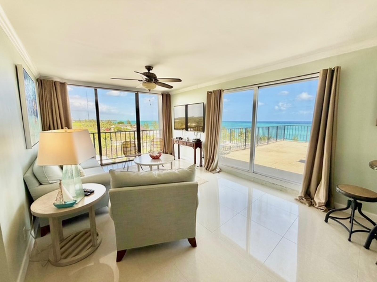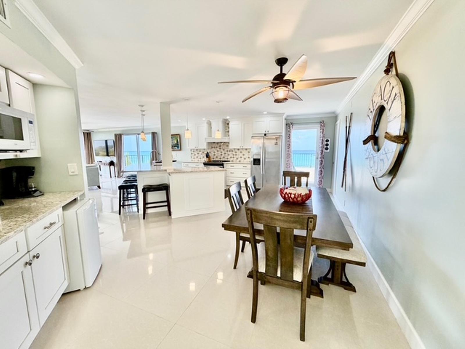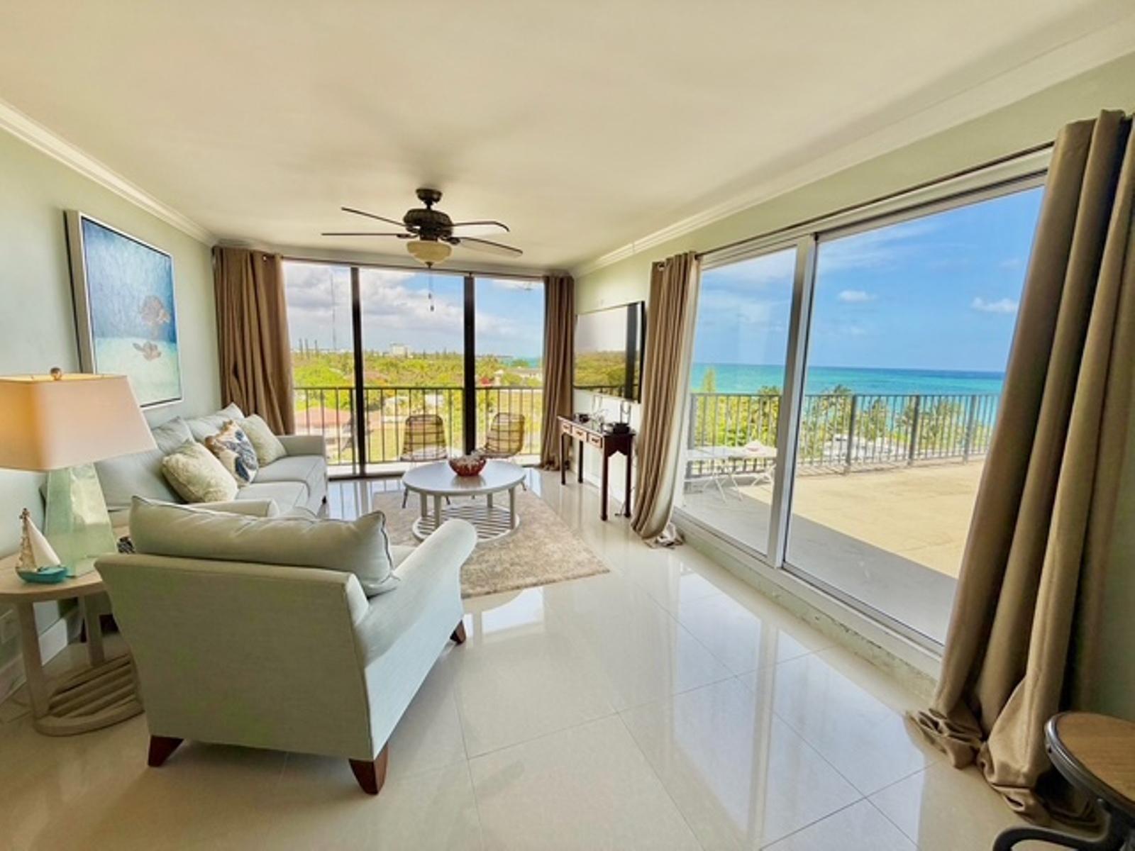 Experience luxury coastal living in this exceptional penthouse residence, offering breathtaking panoramic views of the beach, pool, and turquoise ocean from an expansive 1,900 sq. ft. private terraceâperfect for relaxing, entertaining, or enjoying peaceful walks along the shoreline just steps away. This beautifully updated 2,500 sq. ft. condo features 4 spacious bedrooms and 2.5 bathrooms, with a flexible layout ideal for families, guests, or a home office setup. The open-concept kitchen, living, and dining area is designed for effortless living and entertaining, complete with granite countertops, stainless steel appliances, and seamless indoor-outdoor flow through large sliding glass doors leading directly to the terrace. The dining area comfortably accommodates 6â8 guests, while a charming wet bar nook adds an extra touch of functionality and style. This turnkey property is being sold fully furnished, including dishes, linens, and décorâready for immediate use or rental. Residents enjoy 24-hour security and access to resort-style amenities, including a pool bar and restaurant