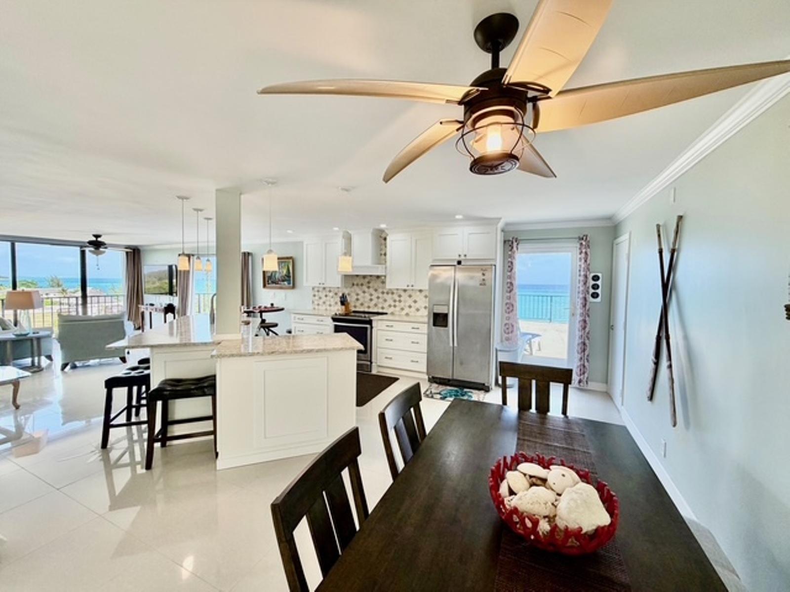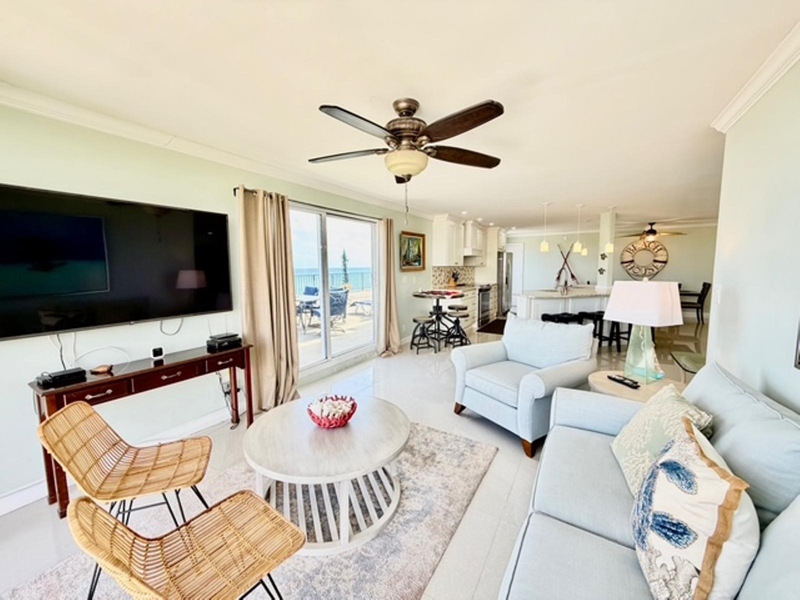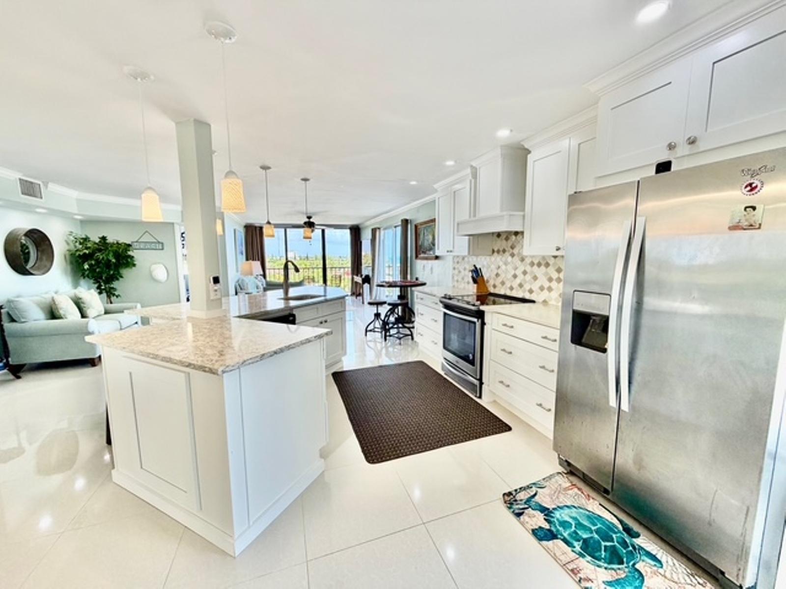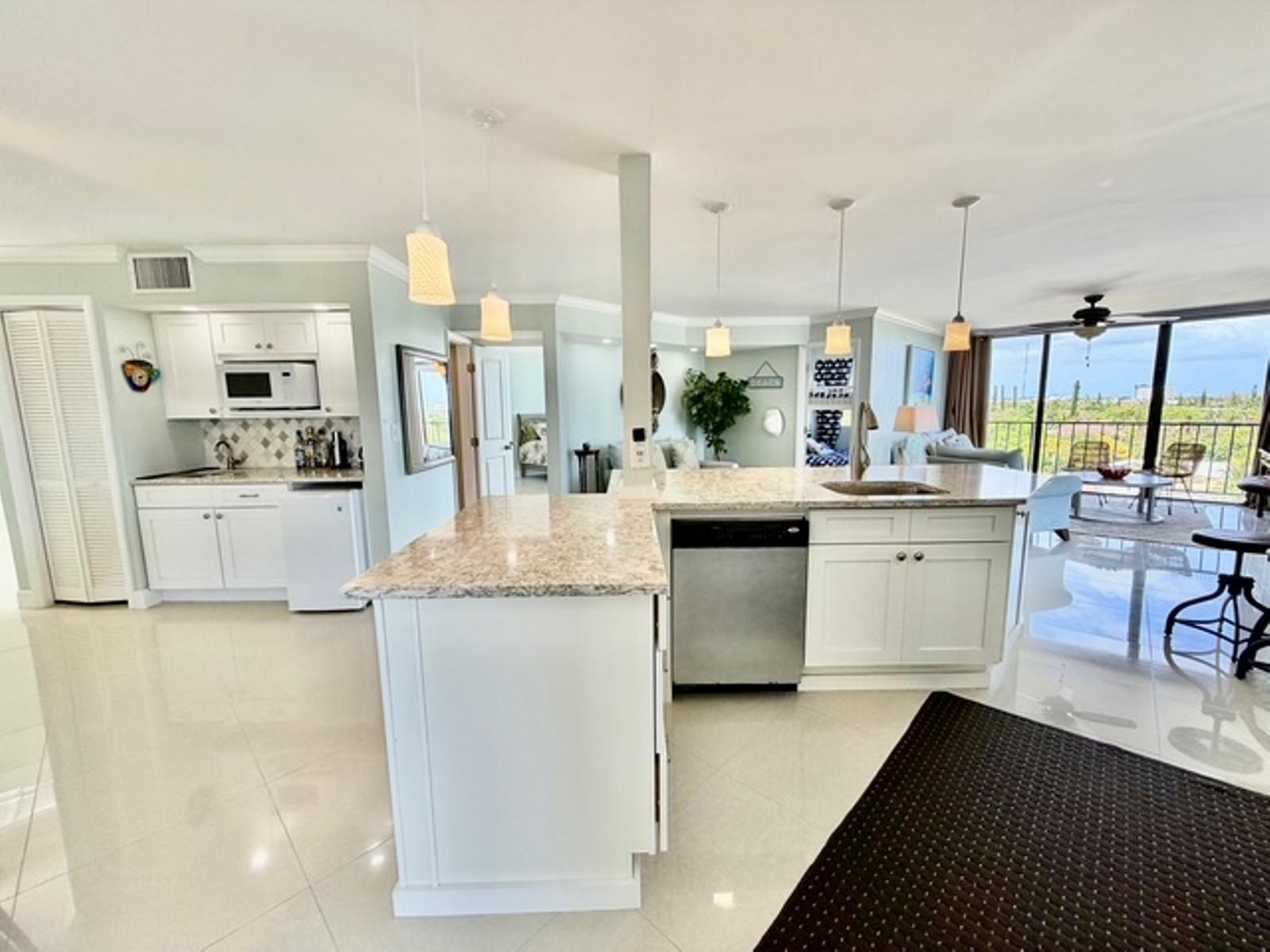 Experience luxury coastal living in this exceptional penthouse residence, offering breathtaking panoramic views of the beach, pool, and turquoise ocean from an expansive 1,900 sq. ft. private terraceâperfect for relaxing, entertaining, or enjoying peaceful walks along the shoreline just steps away. This beautifully updated 2,500 sq. ft. condo features 4 spacious bedrooms and 2.5 bathrooms, with a flexible layout ideal for families, guests, or a home office setup. The open-concept kitchen, living, and dining area is designed for effortless living and entertaining, complete with granite countertops, stainless steel appliances, and seamless indoor-outdoor flow through large sliding glass doors leading directly to the terrace. The dining area comfortably accommodates 6â8 guests, while a charming wet bar nook adds an extra touch of functionality and style. This turnkey property is being sold fully furnished, including dishes, linens, and décorâready for immediate use or rental. Residents enjoy 24-hour security and access to resort-style amenities, including a pool bar and restaurant