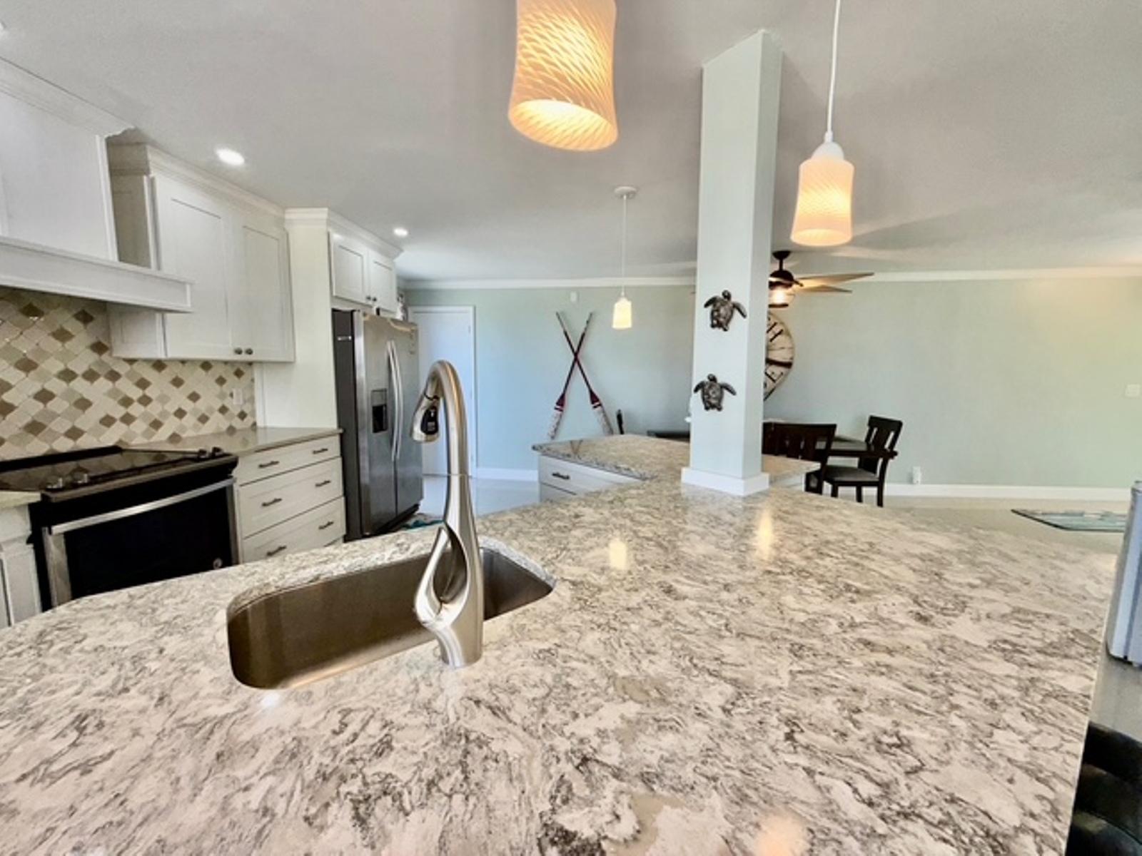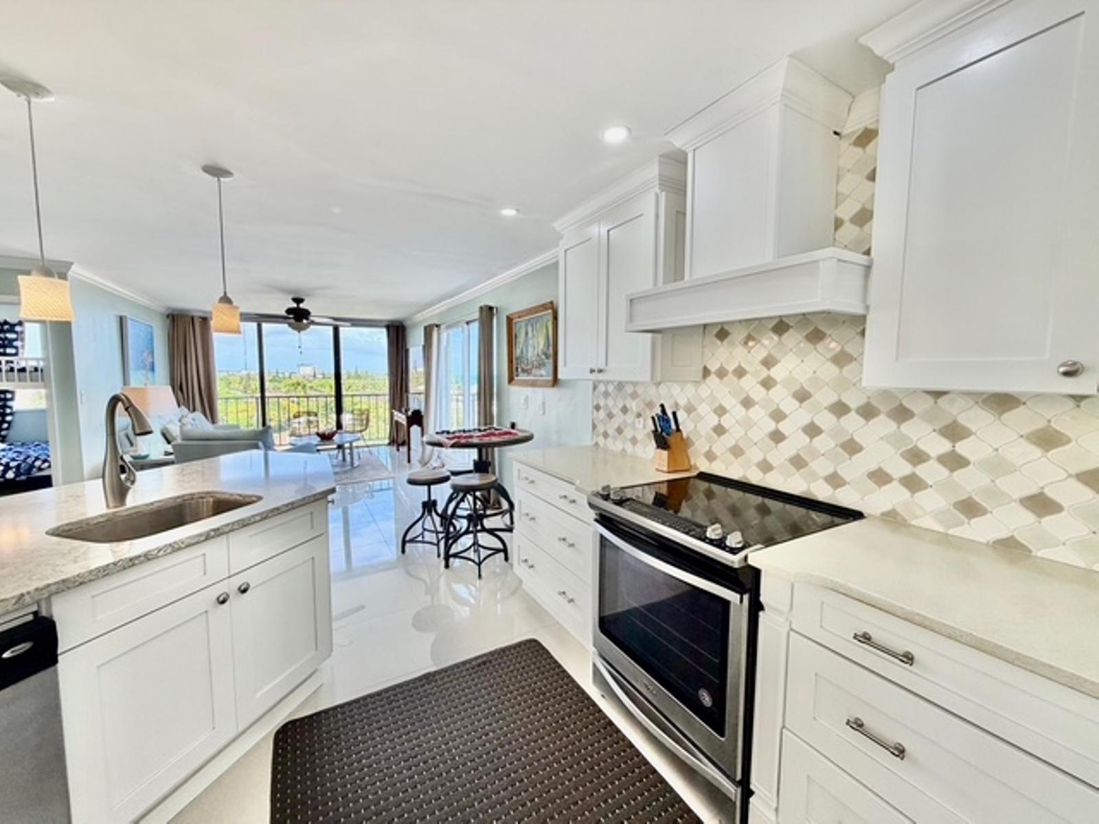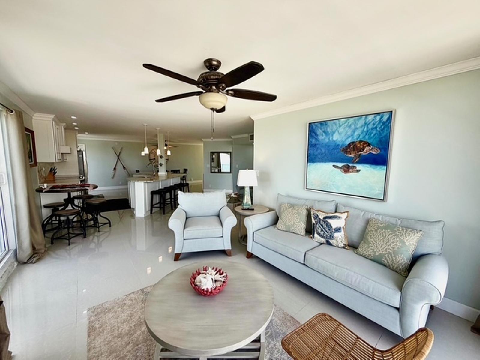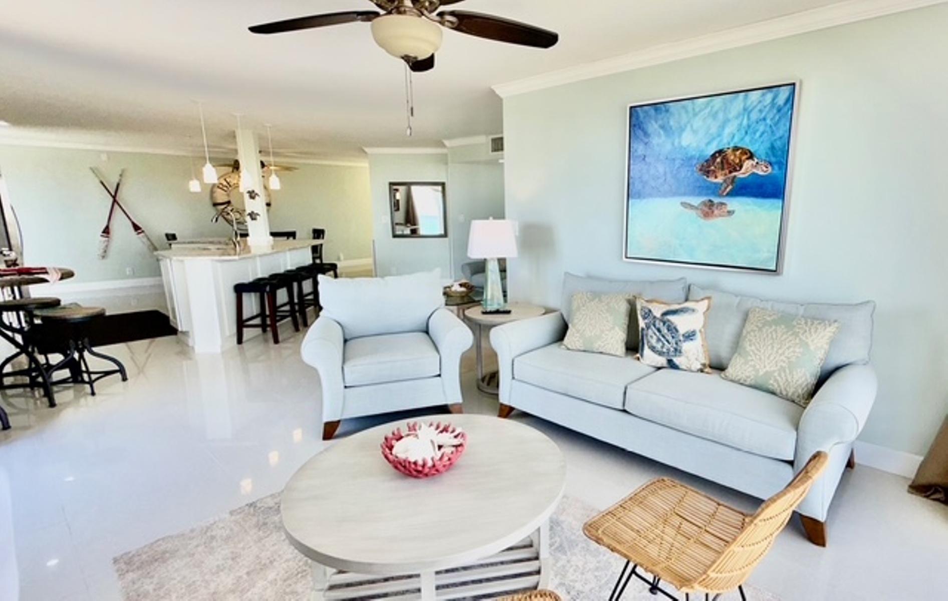 Experience luxury coastal living in this exceptional penthouse residence, offering breathtaking panoramic views of the beach, pool, and turquoise ocean from an expansive 1,900 sq. ft. private terraceâperfect for relaxing, entertaining, or enjoying peaceful walks along the shoreline just steps away. This beautifully updated 2,500 sq. ft. condo features 4 spacious bedrooms and 2.5 bathrooms, with a flexible layout ideal for families, guests, or a home office setup. The open-concept kitchen, living, and dining area is designed for effortless living and entertaining, complete with granite countertops, stainless steel appliances, and seamless indoor-outdoor flow through large sliding glass doors leading directly to the terrace. The dining area comfortably accommodates 6â8 guests, while a charming wet bar nook adds an extra touch of functionality and style. This turnkey property is being sold fully furnished, including dishes, linens, and décorâready for immediate use or rental. Residents enjoy 24-hour security and access to resort-style amenities, including a pool bar and restaurant