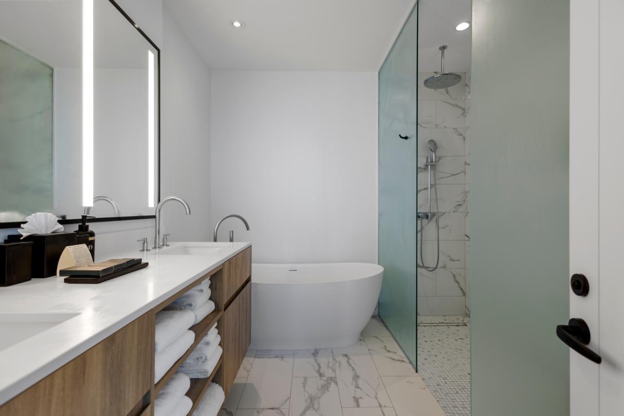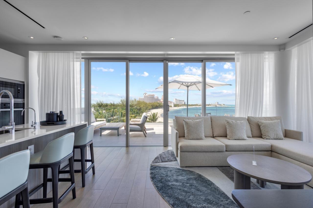 Goldwynn resort features a soft and modern design that blends with the shoreline just steps away from the water. This stunning 2-bed suite is located on the hotel side of the complex. The residence offers almost 1400 sq ft of living space with 1213 sq ft for the main unit plus an additional 712 sq ft for the balcony alone. The full kitchen has high-end appliances, cabinets and countertops. Both bedrooms have ensuite bathrooms with premium fixtures and amenities. The residence features a lock off option allowing you to either enjoy the entire space or close off one side for yourself while you rent out the other. The best part of this suite is the private balcony that gives you amazing views of the ocean and the island. The suite also has custom blackout drapes, individual air-conditioning and access to all resort facilities, such as 3 dining options, spa, rooftop bar & pool for condo owners only, state of the art gym and more!