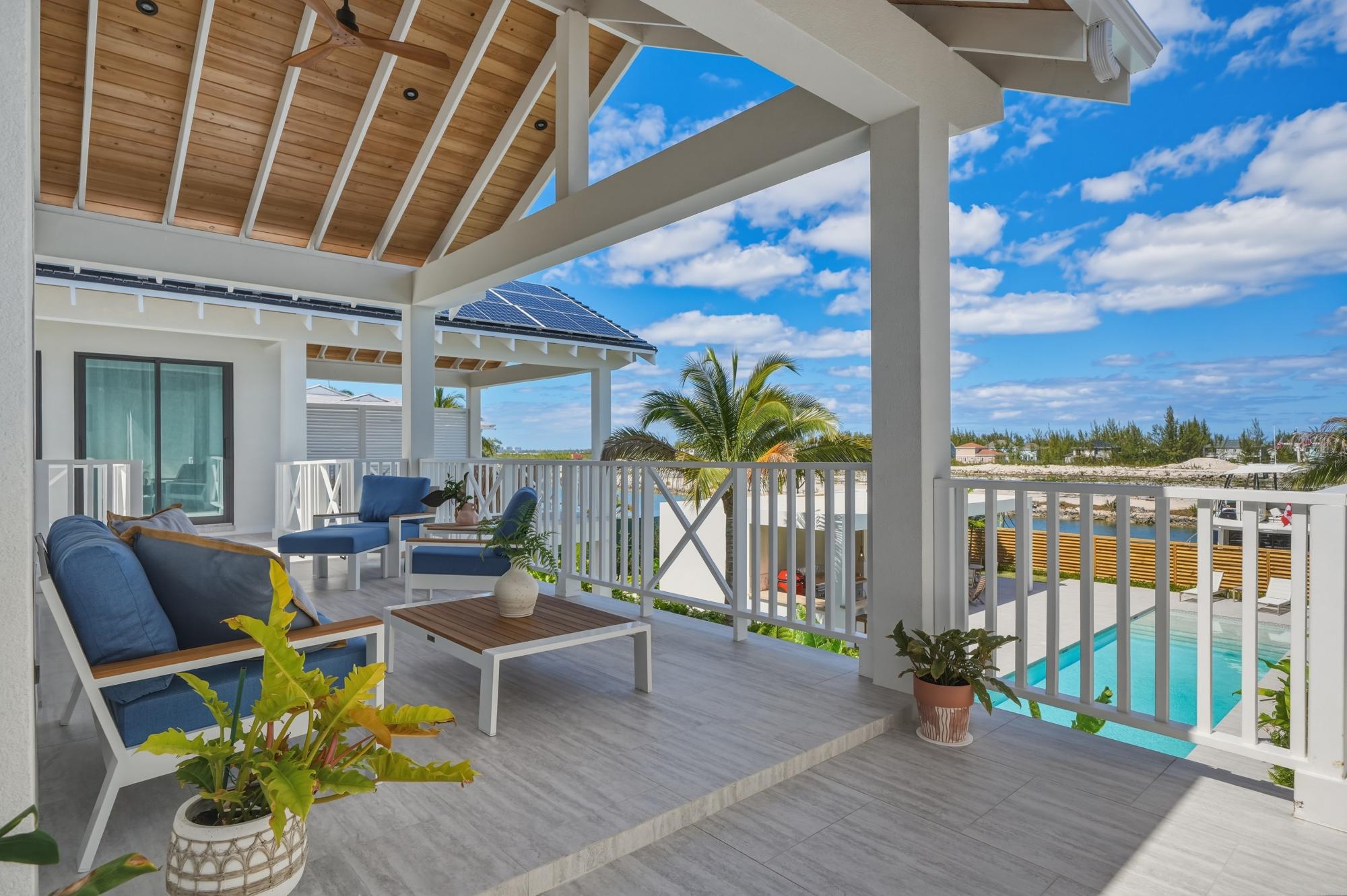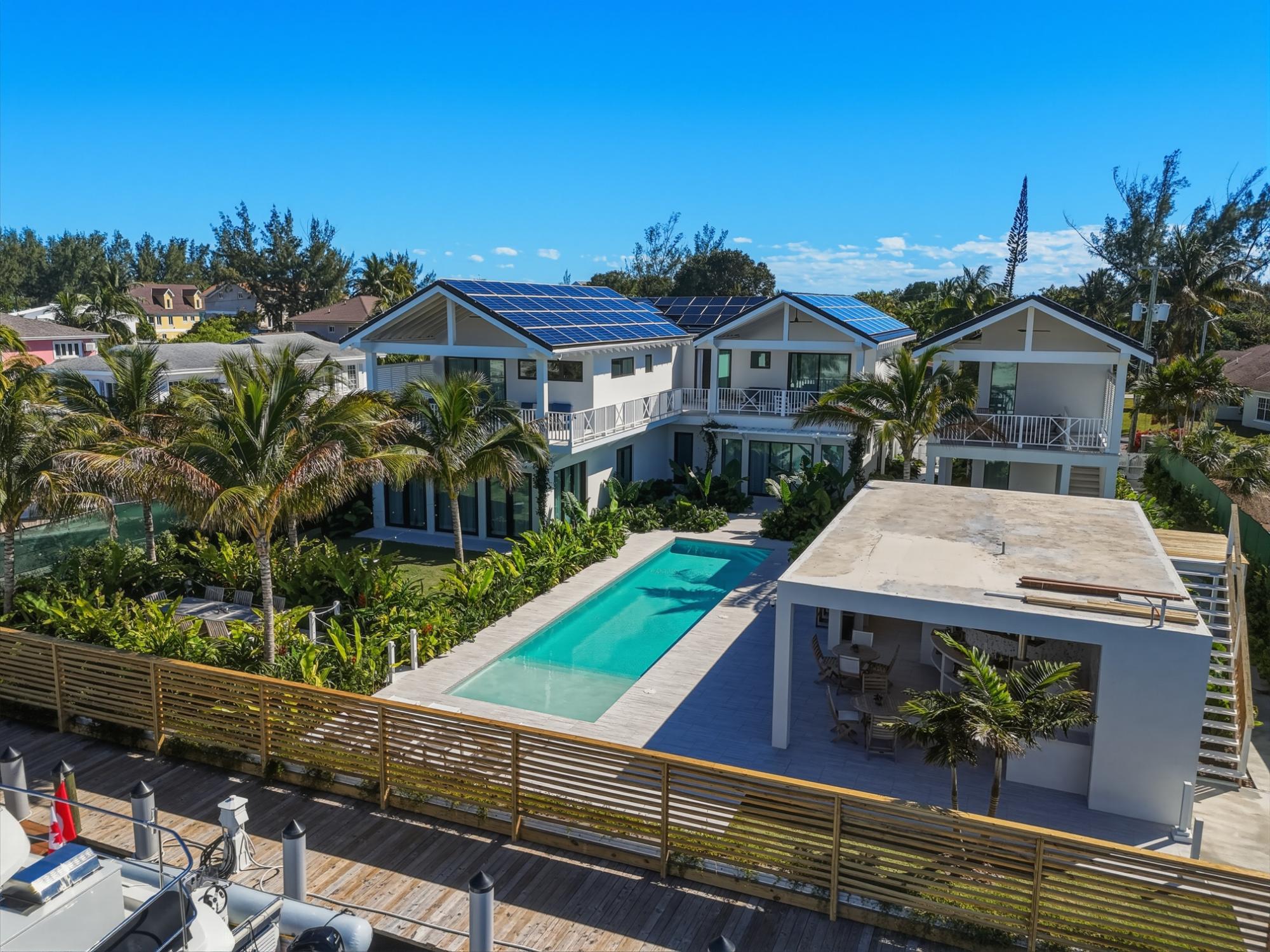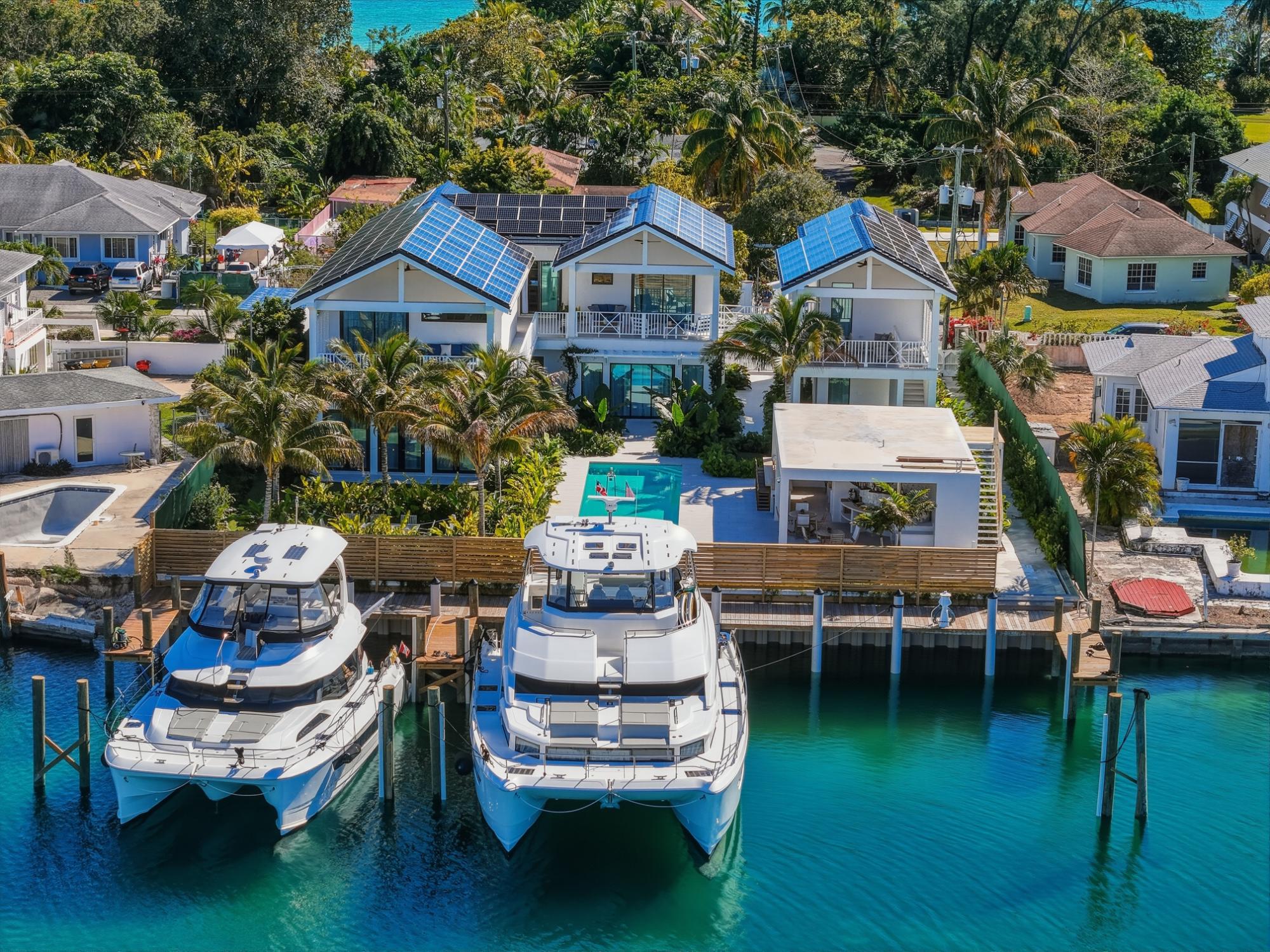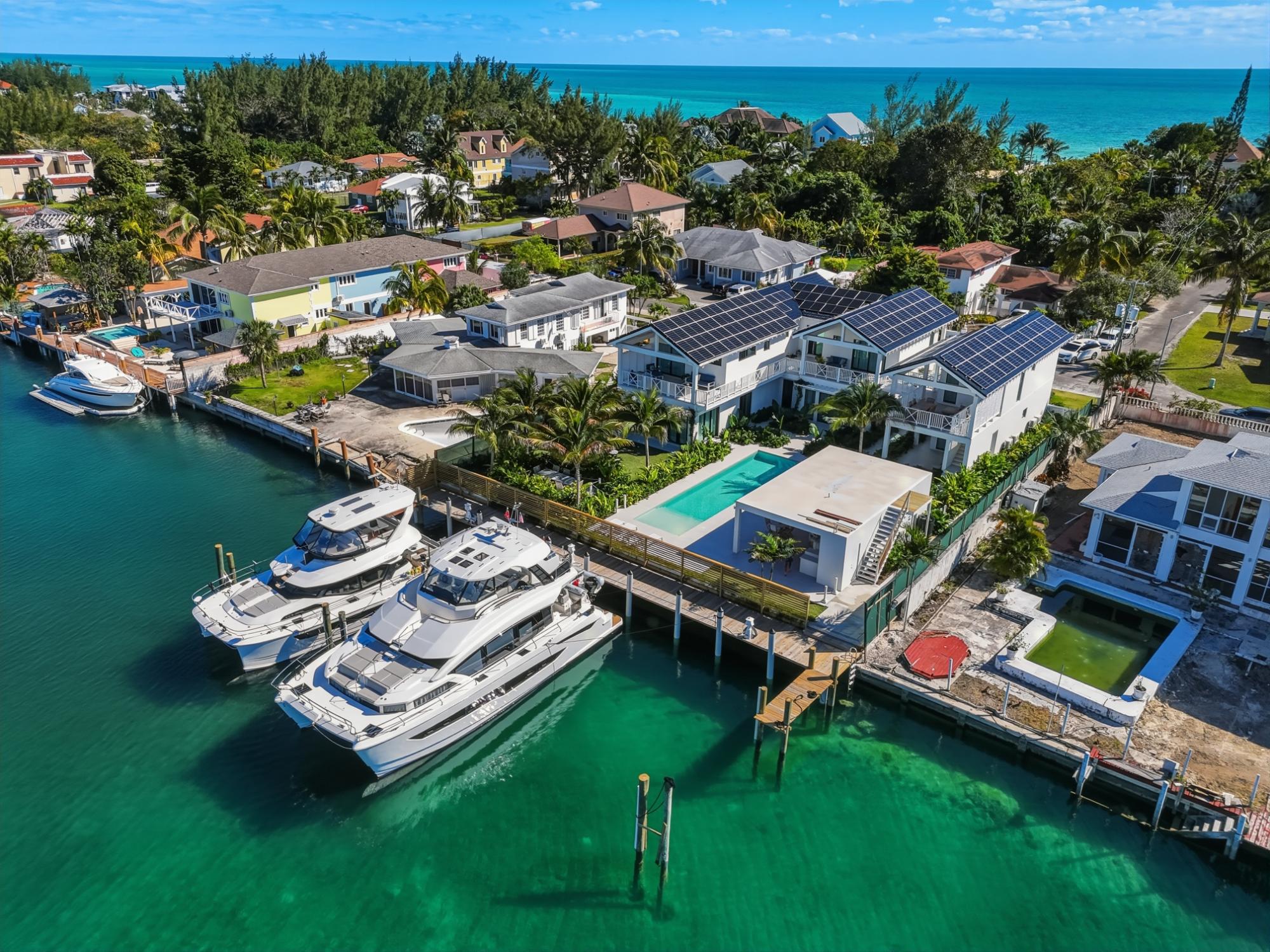Completed in 2025 and designed with deliberate intention, Le Canal is one of the most compelling residential offerings to come to market in Nassau in recent memory. Set on a 14,000 sq ft lot along the protected canal in Coral Harbour â a quiet, no-through-road enclave minutes from the international airport and the best of Nassau â the property unfolds across 6,700 square feet of thoughtfully conceived living, with a dock capable of accommodating two vessels of significant size and direct access to open water. The architecture is quintessentially Bahamian in spirit â white stucco, metal roof, cedar-lined covered terraces â but the execution is unmistakably international in standard. Solar panels across both structures speak to a commitment to energy independence, while steel and concrete construction, full insulation, and a drilled well with reverse osmosis ensure the home performs as well as it presents. The property conveys fully furnished and includes a detached guest house, workshop, three-car garage, and parking for eight â a compound in every sense.