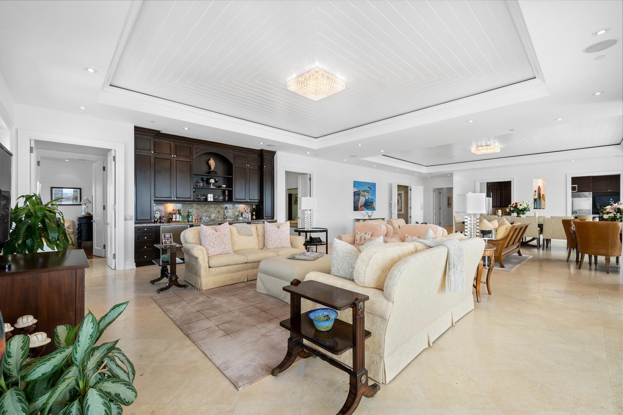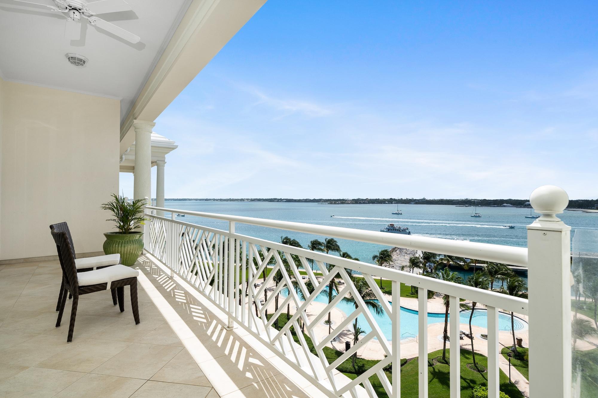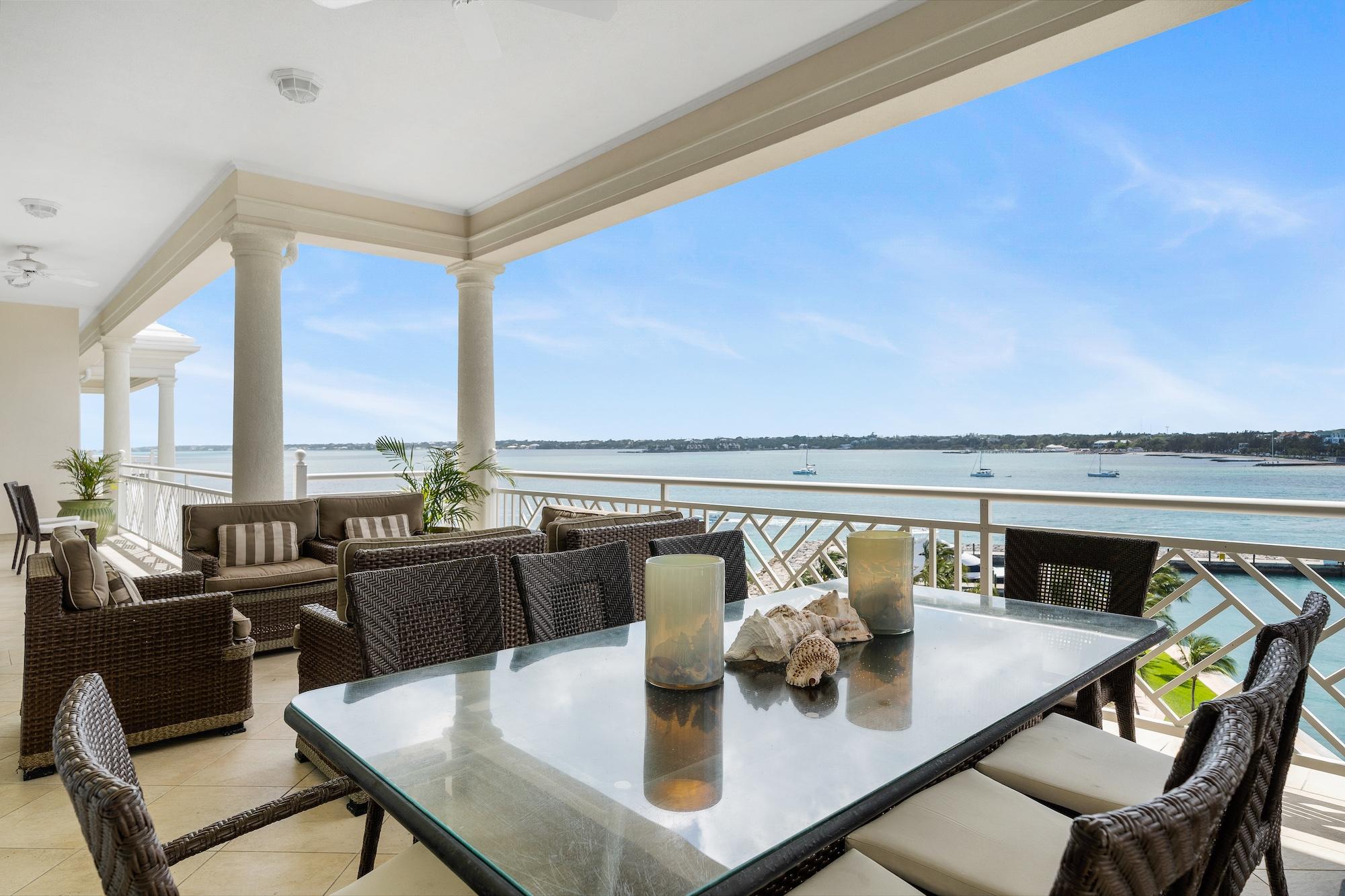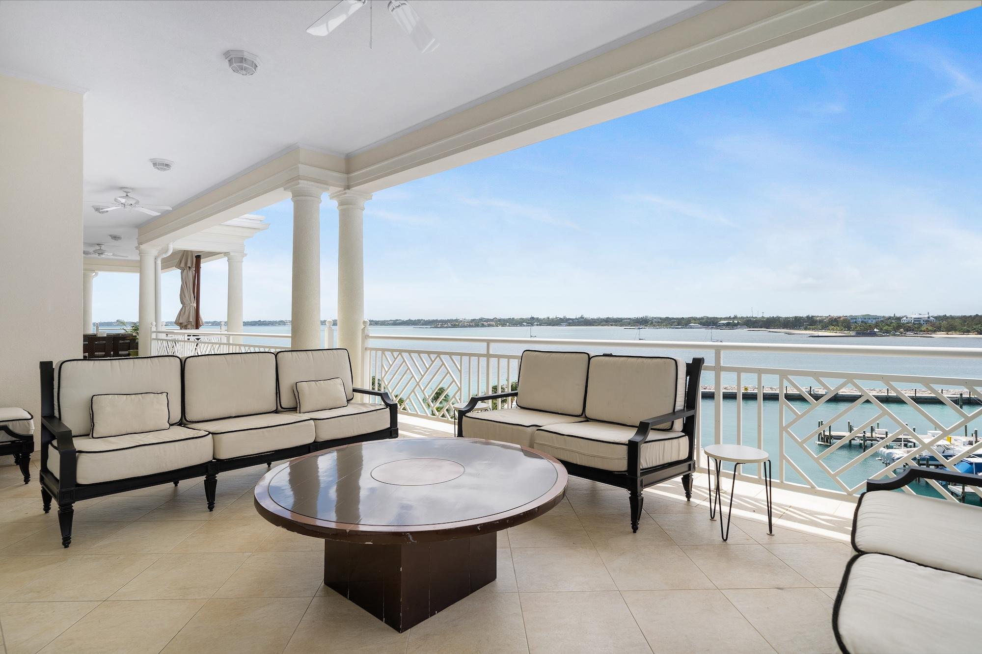 Enjoy exquisite bay, golf course, and ocean views from this luxurious 4 bedroom 4.5 bathroom, 6,570sf Penthouse located in Ocean Club Residences in the exclusive gated beachfront and golf course community of Ocean Club Estates on Paradise Island. This Penthouse has an open floorplan with living room, dining room, and TV room all leading out to an expansive covered terrace overlooking the pools, marina and harbour. The spacious master suite features hardwood floors, an office, and his & her bathrooms. The master bedroom has serene harbour views while her master bathroom overlooks the golf course and ocean beyond. All of the bedrooms have ensuite bathrooms and also private covered balconies with golf course and sea views. The custom kitchen features include Dual Stainless Steel refrigerator/freezers, an illuminated center island, solid wood cabinetry, and granite countertops. Ocean Club Residences amenities include on-site concierge, a gym and fitness room, two pools, a private marina, a Beach Club with an infinity pool, tennis courts, and membership access to the Atlantis resort.