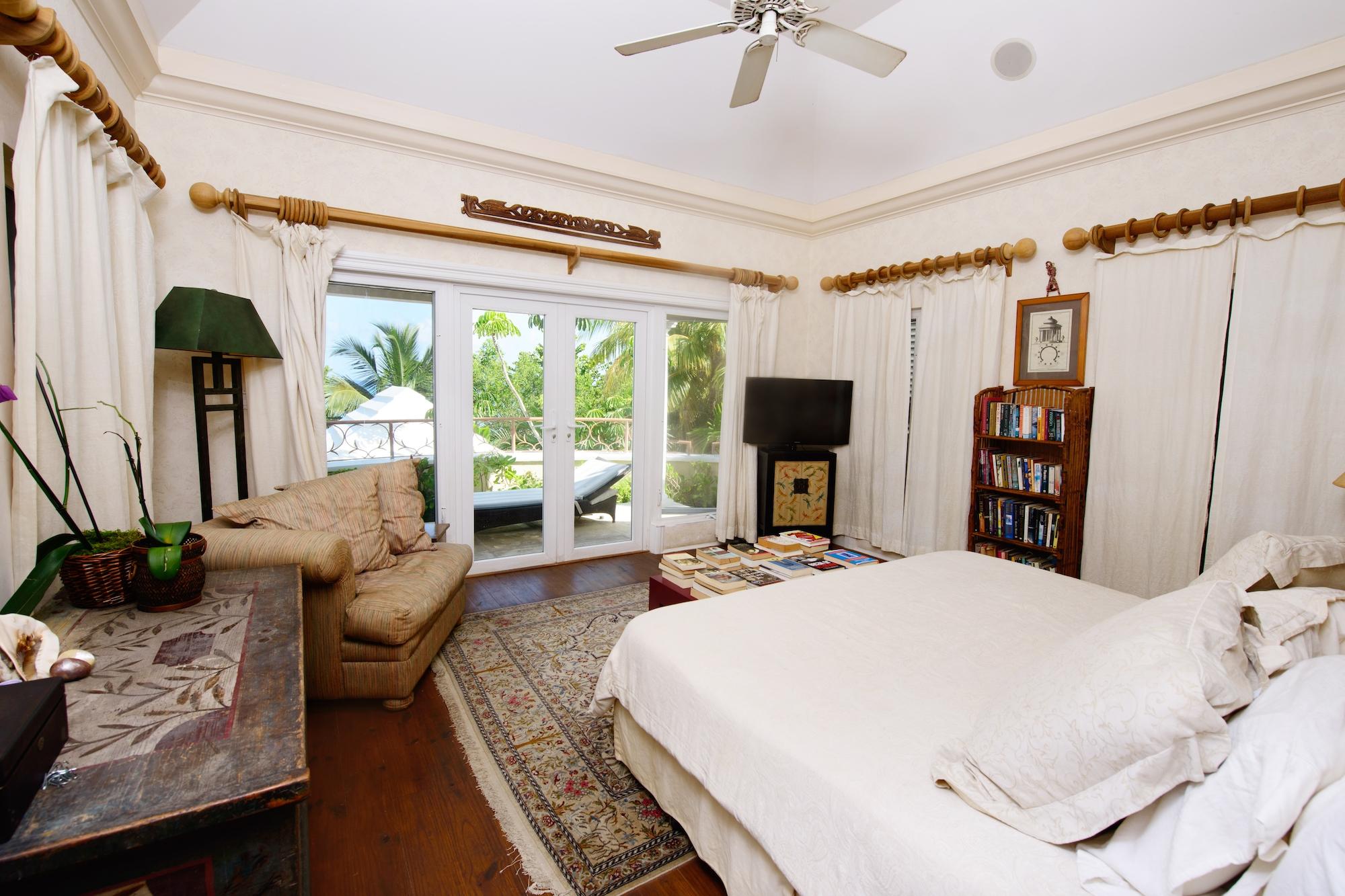 This rare beachfront rental home is located on a private gated road in Old Fort Point sitting on just under an acre of land. With 4 bedrooms and 5 bathrooms, this property offers 5,000 sq. ft. of living space with expansive balcony sitting areas on both sides of the home. Spacious and inviting, the main floor hosts an impressive reception room, a well-equipped kitchen, a dining room and a living room that all seamlessly connect to each other. All 4 bedrooms have en-suite bathrooms and the master suite offers stunning ocean views with a large balcony space, walk-in closet and a spa-inspired bathroom. Glass doors open to large covered terraces, expansive lush gardens and a white sandy beach. The front balcony features an expansive pool with a hot tub. This is a turnkey rental home, great for families and entertaining.