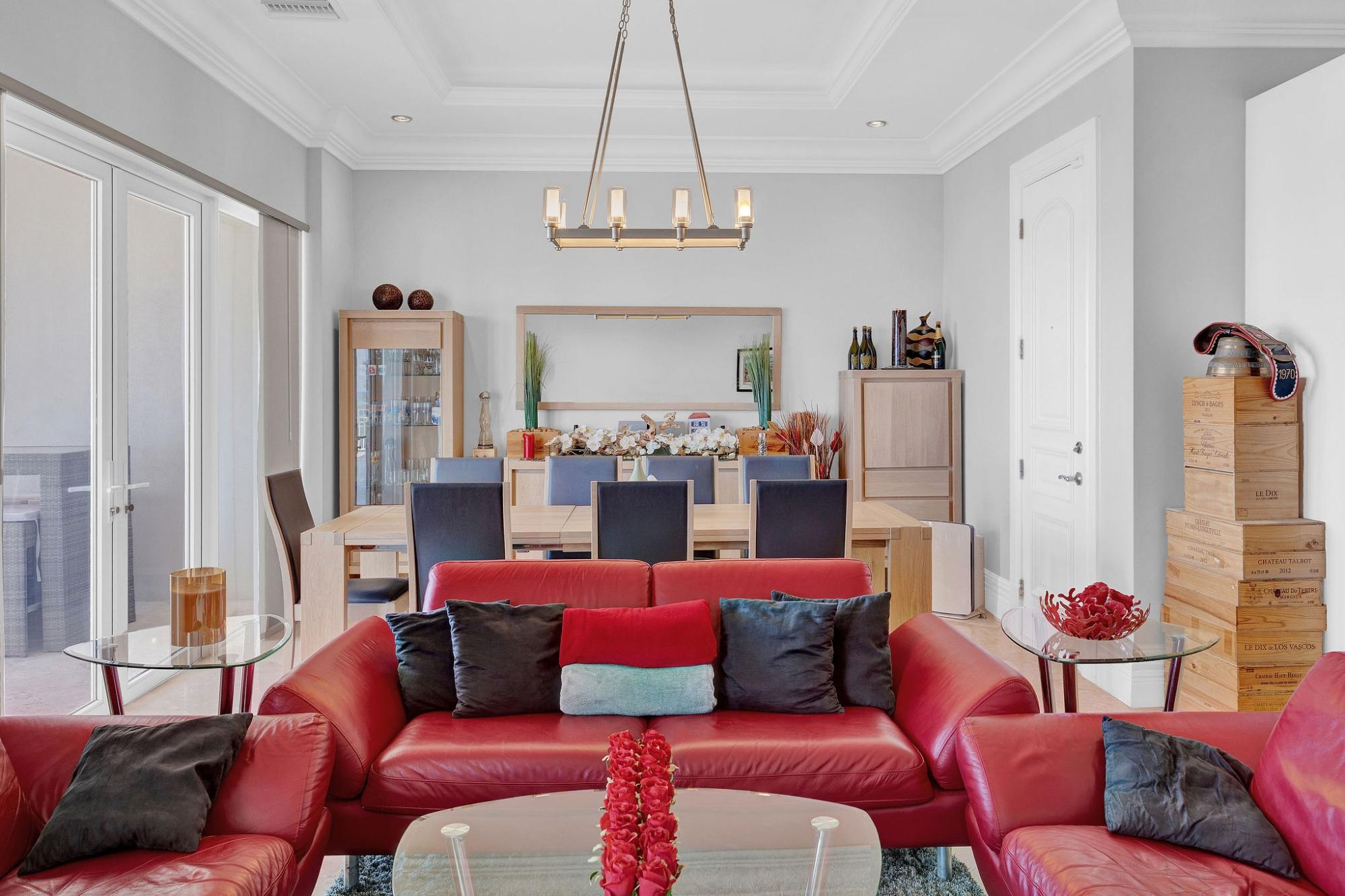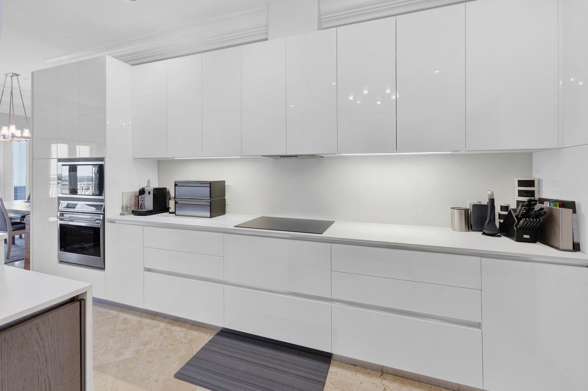Situated on the fifth floor, this refined 3-bedroom, 2.5-bath residence offers sweeping ocean and golf course views across approximately 2,798 sq. ft. of elegant indoor-outdoor living. A private elevator opens directly into a bright, open-concept living area that flows seamlessly onto a spacious covered balcony, perfect for entertaining. The home showcases a custom Italkraft Italian kitchen designed as a social hub, featuring island seating, custom wine racks and glass shelving, two Sub-Zero wine refrigerators, and two Sub-Zero freezer drawers. The primary suite is a private retreat with balcony access, a custom walk-in closet, and a spa-style en-suite bath with Jacuzzi tub. A versatile den with custom cabinetry serves as a third bedroom or office. Upgrades include a monitored alarm system, GE TR5000 surge protection, Aquaboon 3-stage filtration, Pure H2O reverse osmosis, impact windows and doors, stone flooring, and a new LG washer and dryer. Two assigned parking spaces included.