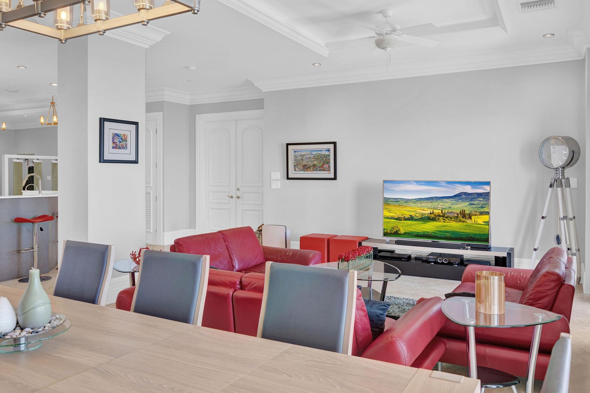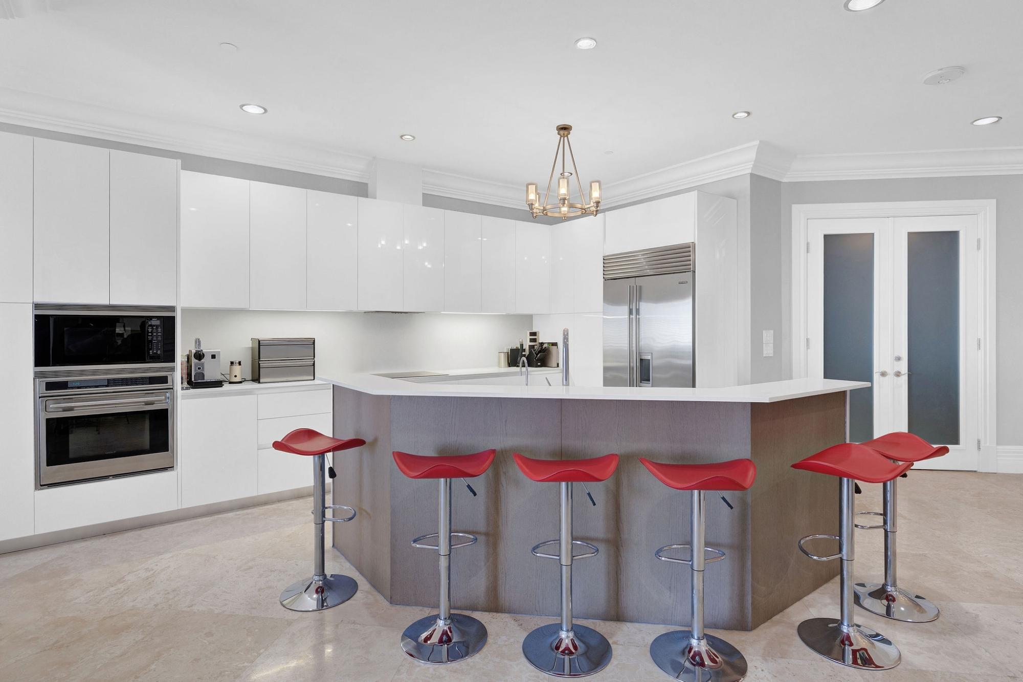 Situated on the fifth floor, this refined 3-bedroom, 2.5-bath residence offers sweeping ocean and golf course views across approximately 2,798 sq. ft. of elegant indoor-outdoor living. A private elevator opens directly into a bright, open-concept living area that flows seamlessly onto a spacious covered balcony, perfect for entertaining. The home showcases a custom Italkraft Italian kitchen designed as a social hub, featuring island seating, custom wine racks and glass shelving, two Sub-Zero wine refrigerators, and two Sub-Zero freezer drawers. The primary suite is a private retreat with balcony access, a custom walk-in closet, and a spa-style en-suite bath with Jacuzzi tub. A versatile den with custom cabinetry serves as a third bedroom or office. Upgrades include a monitored alarm system, GE TR5000 surge protection, Aquaboon 3-stage filtration, Pure H2O reverse osmosis, impact windows and doors, stone flooring, and a new LG washer and dryer. Two assigned parking spaces included.