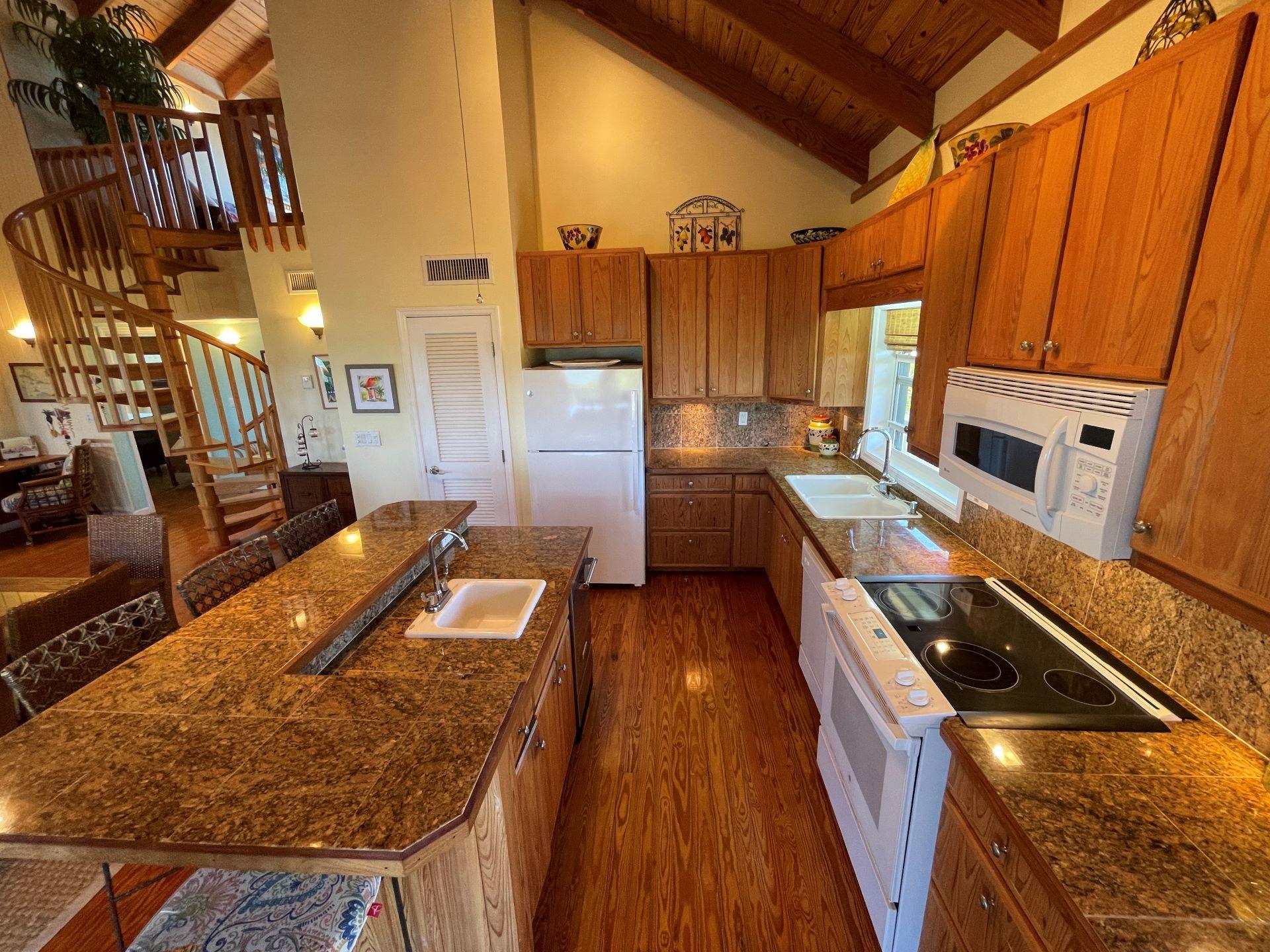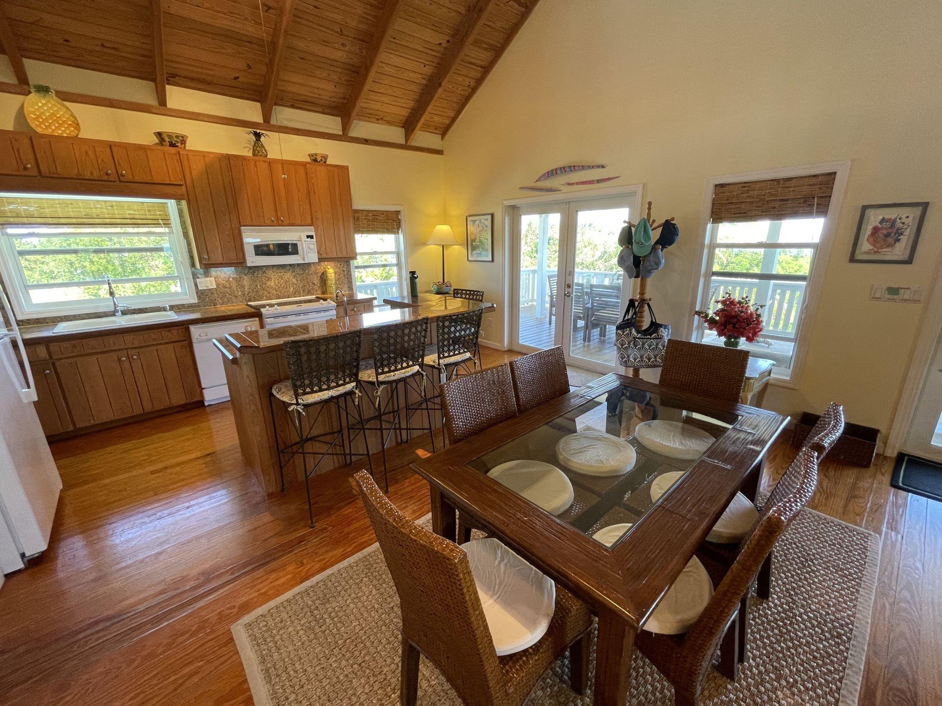 Pineapple Pointe has it all with views to die for, plus a large open plan living area with kitchen, dining and living room providing ample space for entertaining. The primary suite, additional guest suite, and a comfortable loft which is accessed by a hand crafted custom spiral staircase, and a 360-degree deck completes the main floor. The special touches throughout the home like the fun nautical themed custom tile inlays in the baths, granite countertops in the kitchen, a large ice machine, wine cooler, central A/C and even a whole house vacuum system make this home a unique place. There is an additional well-appointed guest apartment with a full bath and private deck on the ground level. In addition to the apartment, the ground level has a large garage with a workbench, a laundry room with a sink and a storage room. The spacious decking wrapping completely around the home offers the rare opportunity for viewing both sunrises and sunsets, with lots of space to relax with friends and family and to enjoy the sweet sea breezes.