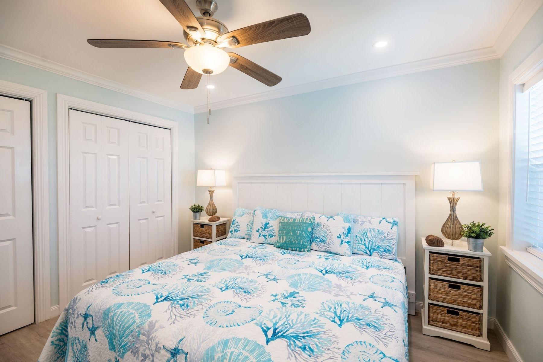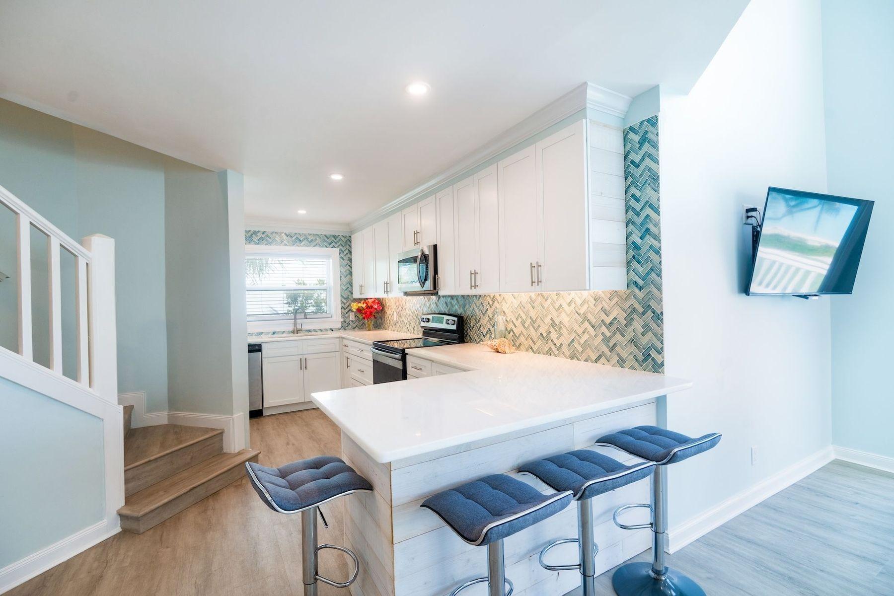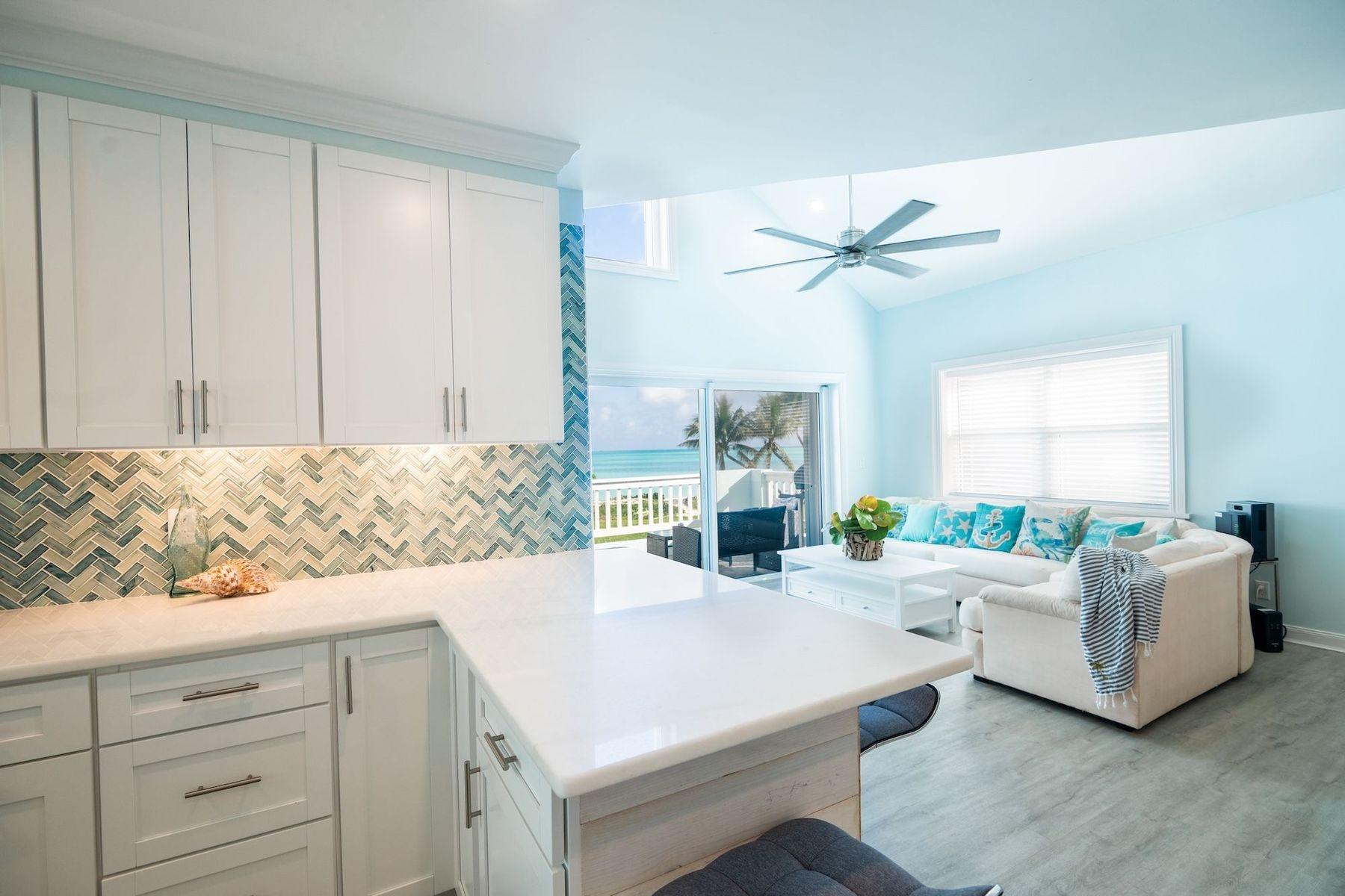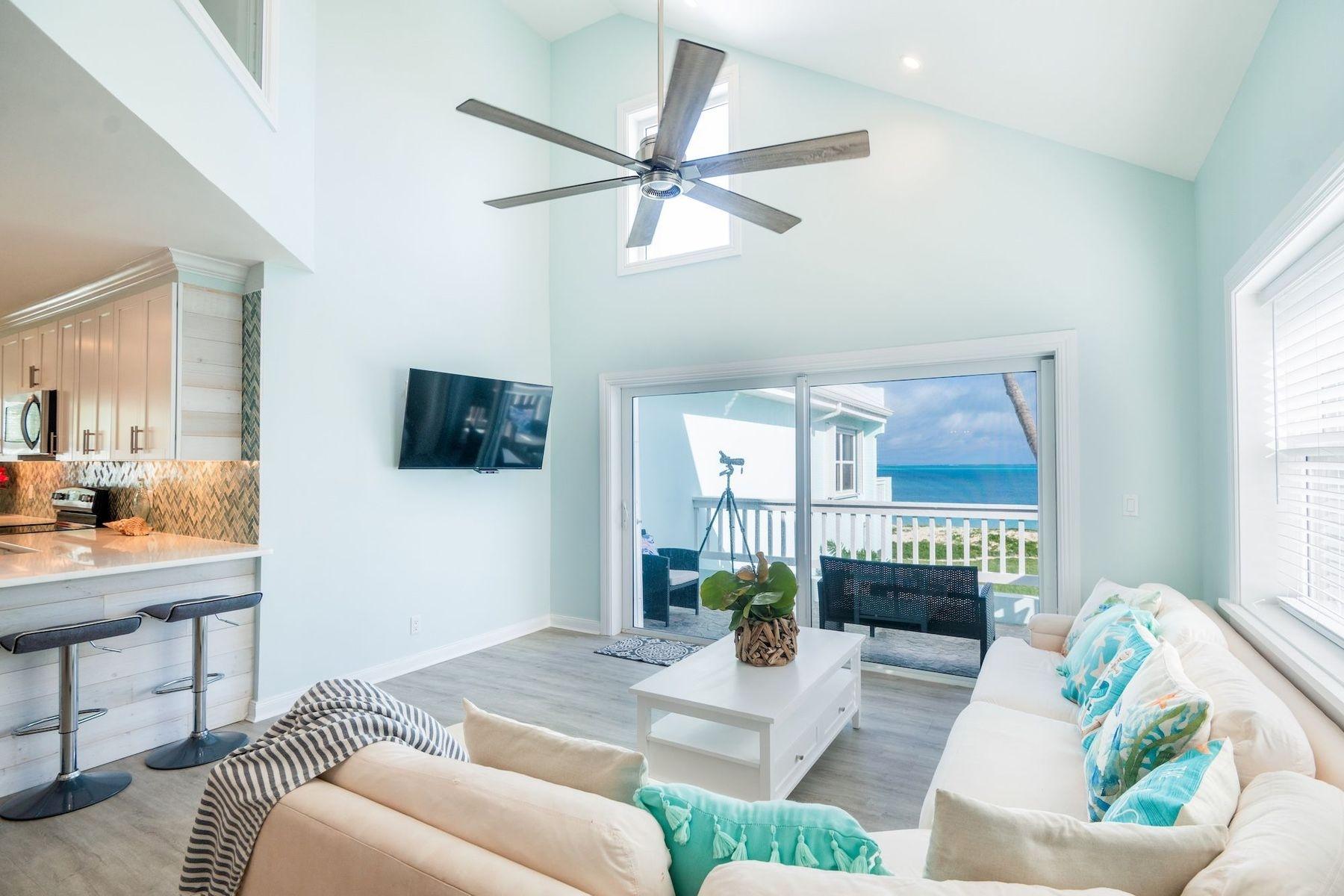 This stunning beachfront condo on Treasure Cay Beach captures the essence of relaxed island living. Just steps from the turquoise waters, it features a protected balcony with sweeping ocean views, three bedrooms, three bathrooms, and a versatile loft suite all fully furnished and turnkey. With a coastal palette, driftwood-toned flooring, and a whitewashed v-joint feature wall, the interiors exude understated elegance. The chef-inspired kitchen boasts white shaker cabinetry, a herringbone glass backsplash, and Blanco Classico Venato marble countertops, blending sophistication with coastal charm. The primary suite offers a king bed, ensuite bath, and his-and-hers closets, while all bathrooms feature glass, subway, and pebble tile accents reflecting the surrounding seascape. Located in a boutique community of 16 residences, the home includes impact-rated windows and doors, a standing seam aluminum roof, and an oversized garage. Residents enjoy a heated pool, tennis, and pickleball courts, offering a serene island lifestyle with effortless access to the beach and panoramic sea views.