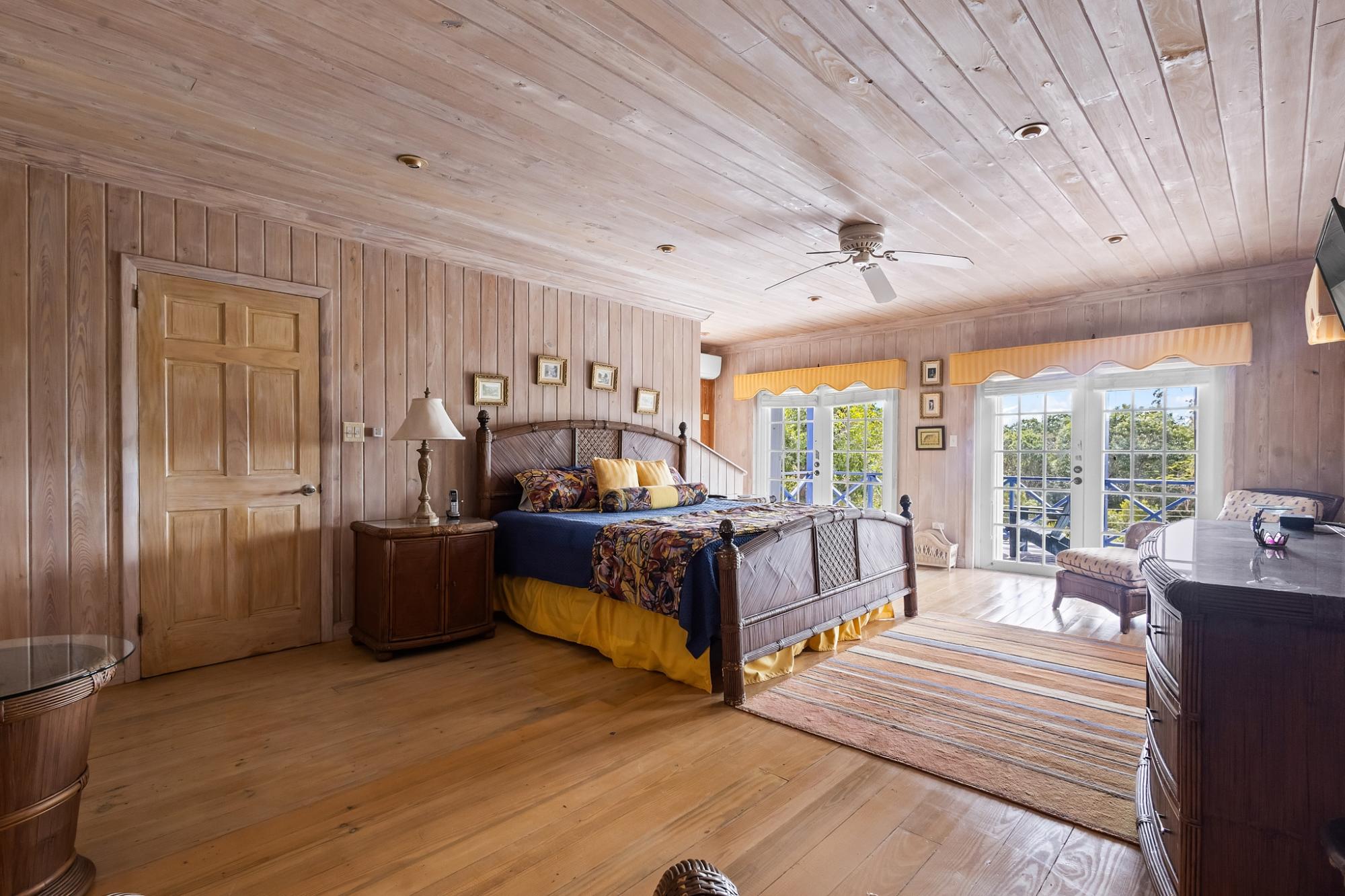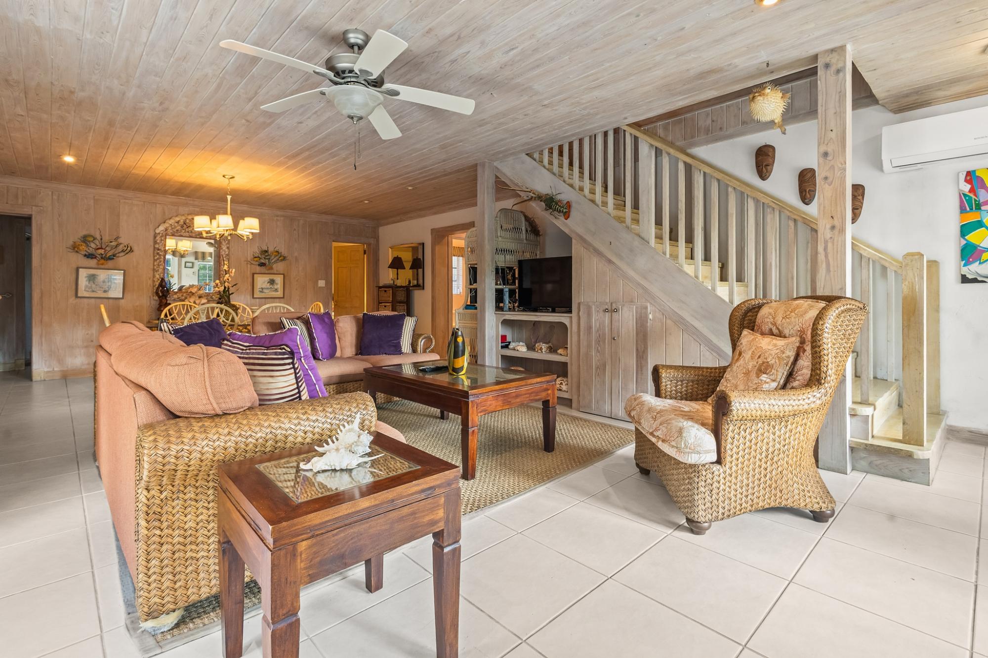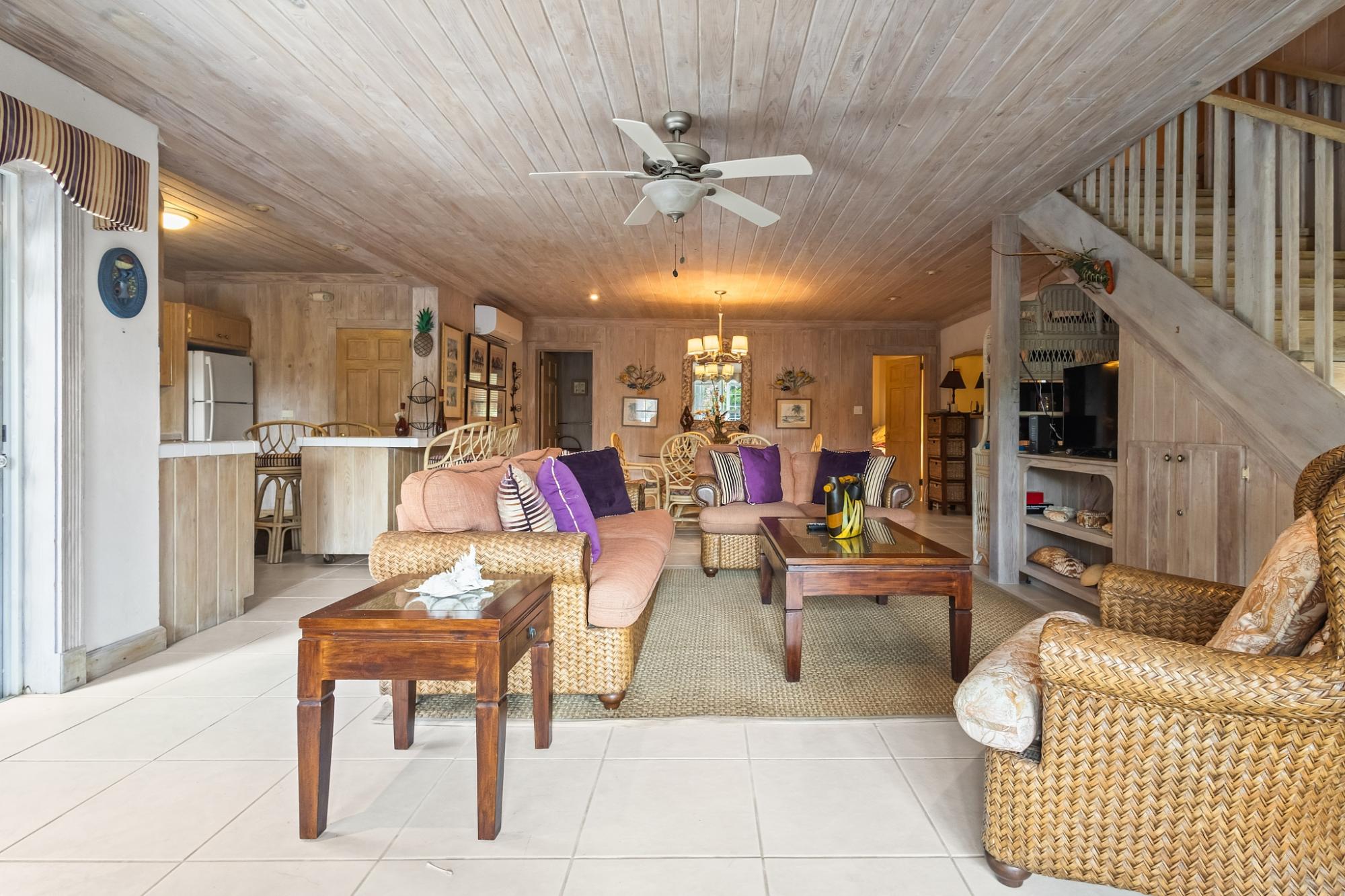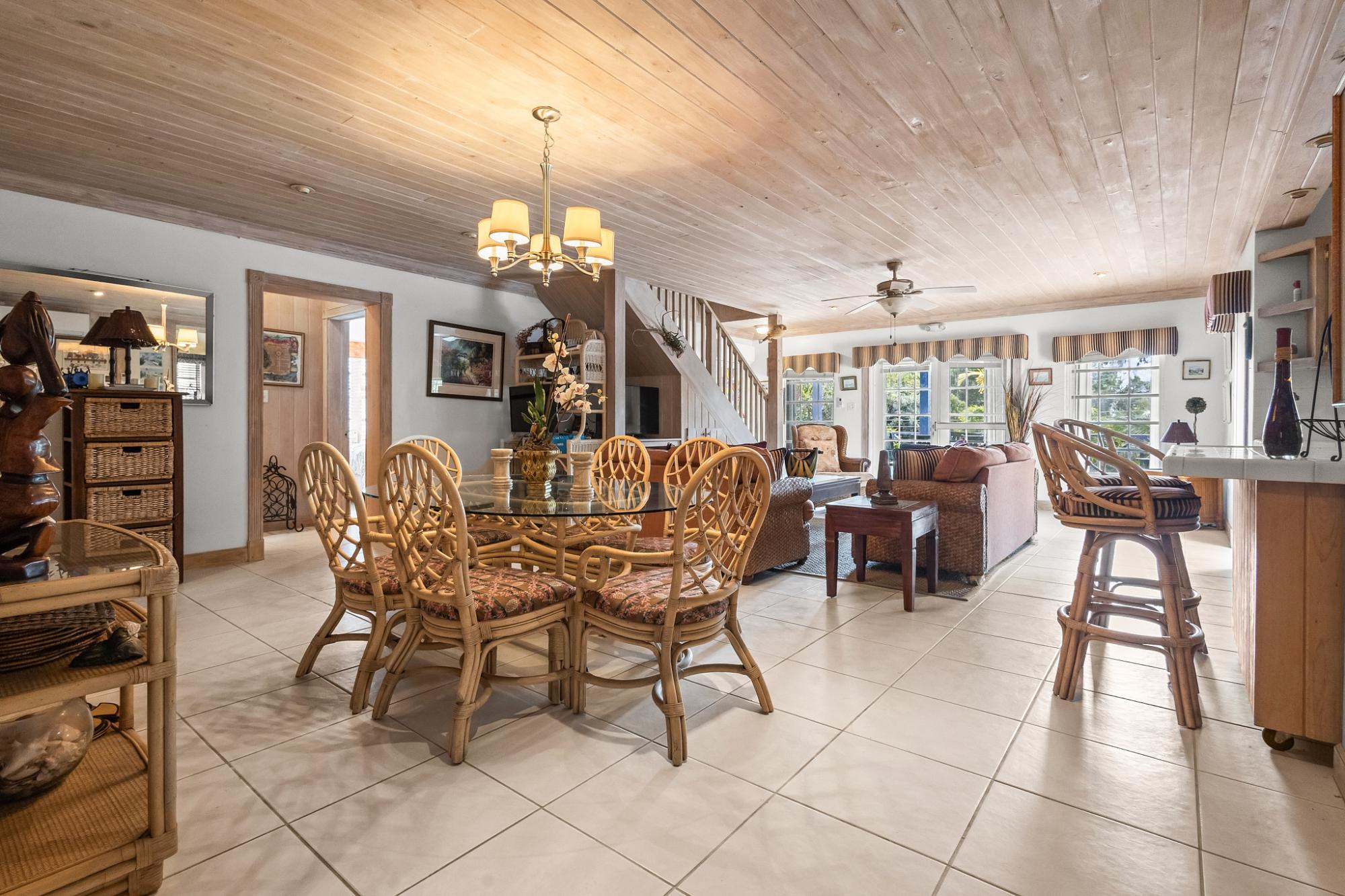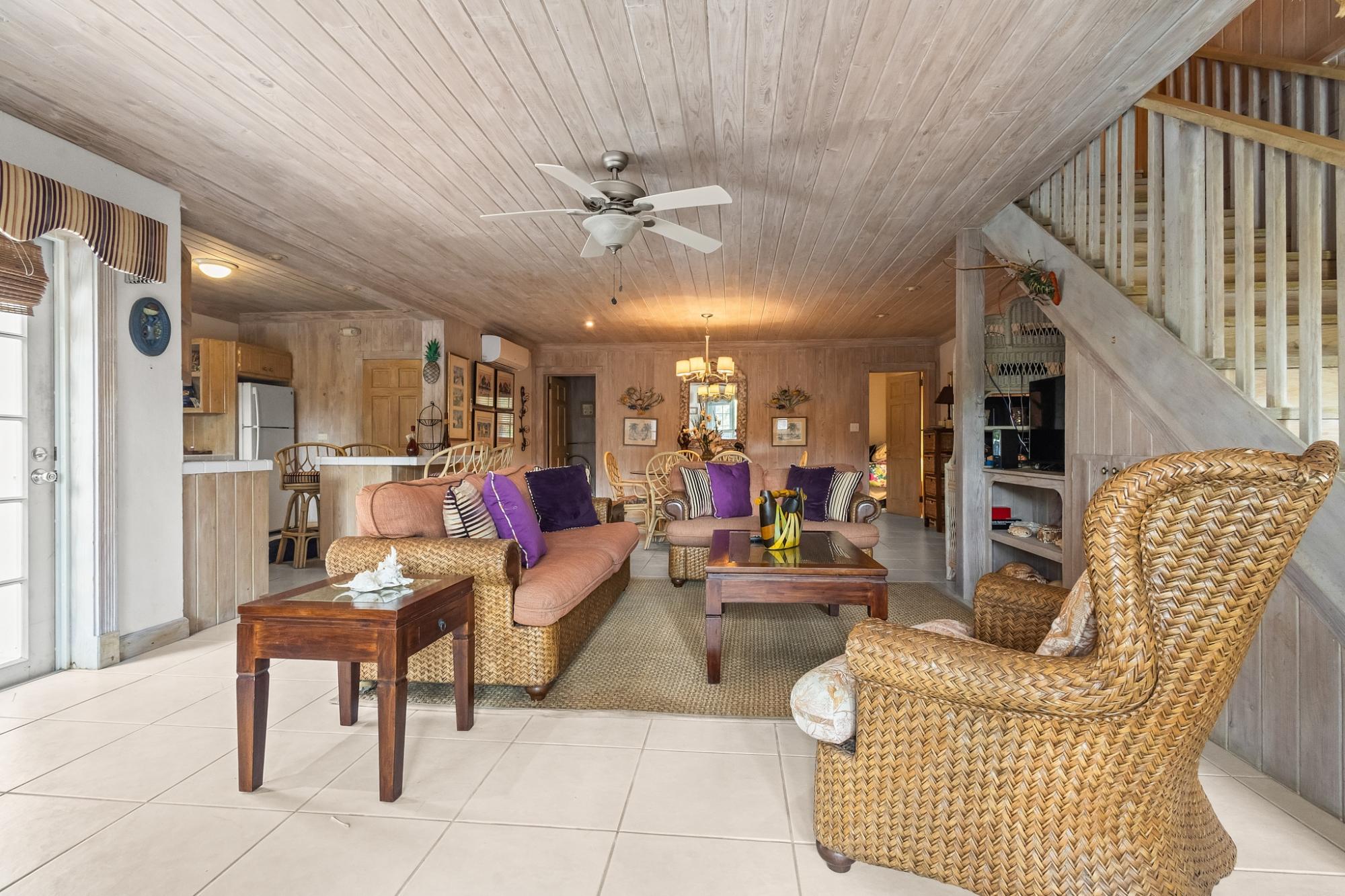 Sea Vision is a Bahamian-style residence located in the established community of Triana Shores, offering elevated views toward Harbour Island and stunning sunset vistas. Designed with classic island architecture, the home features native wood ceilings, an open living and dining layout, generous storage, and multiple balconies that capture natural light and ocean breezes. With over 1,000 square meters of outdoor deck space and mature fruit trees, the property is well-suited for guest entertaining and indoor-outdoor living.