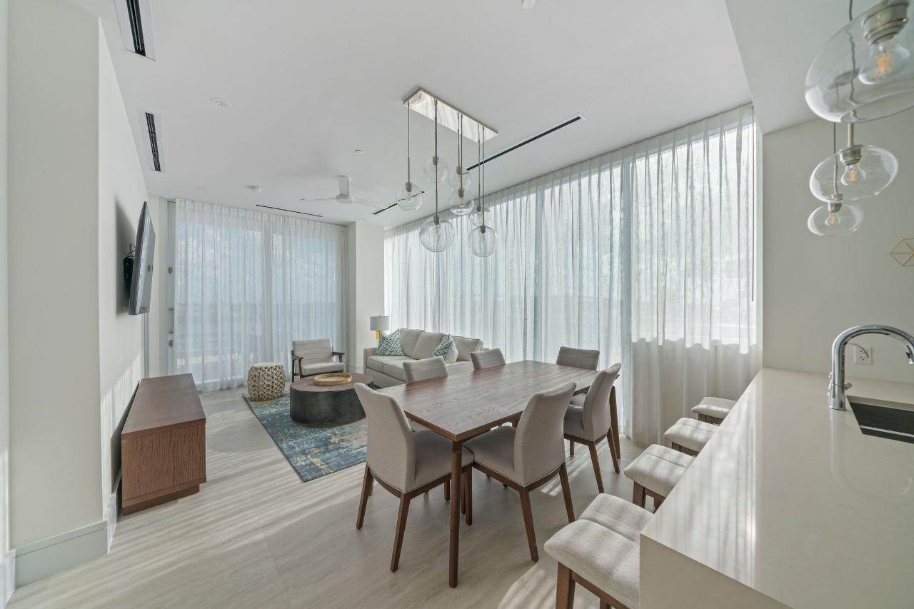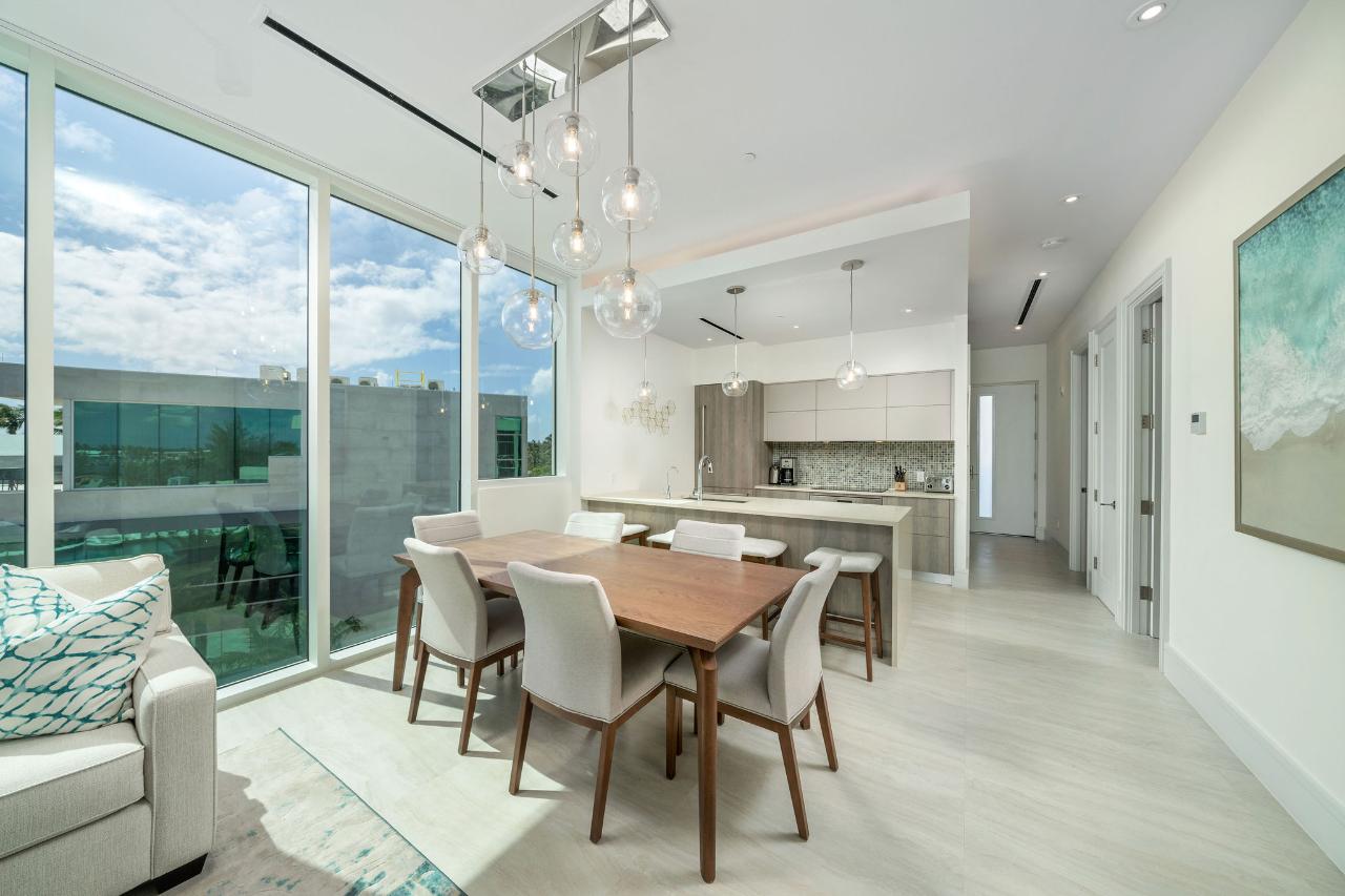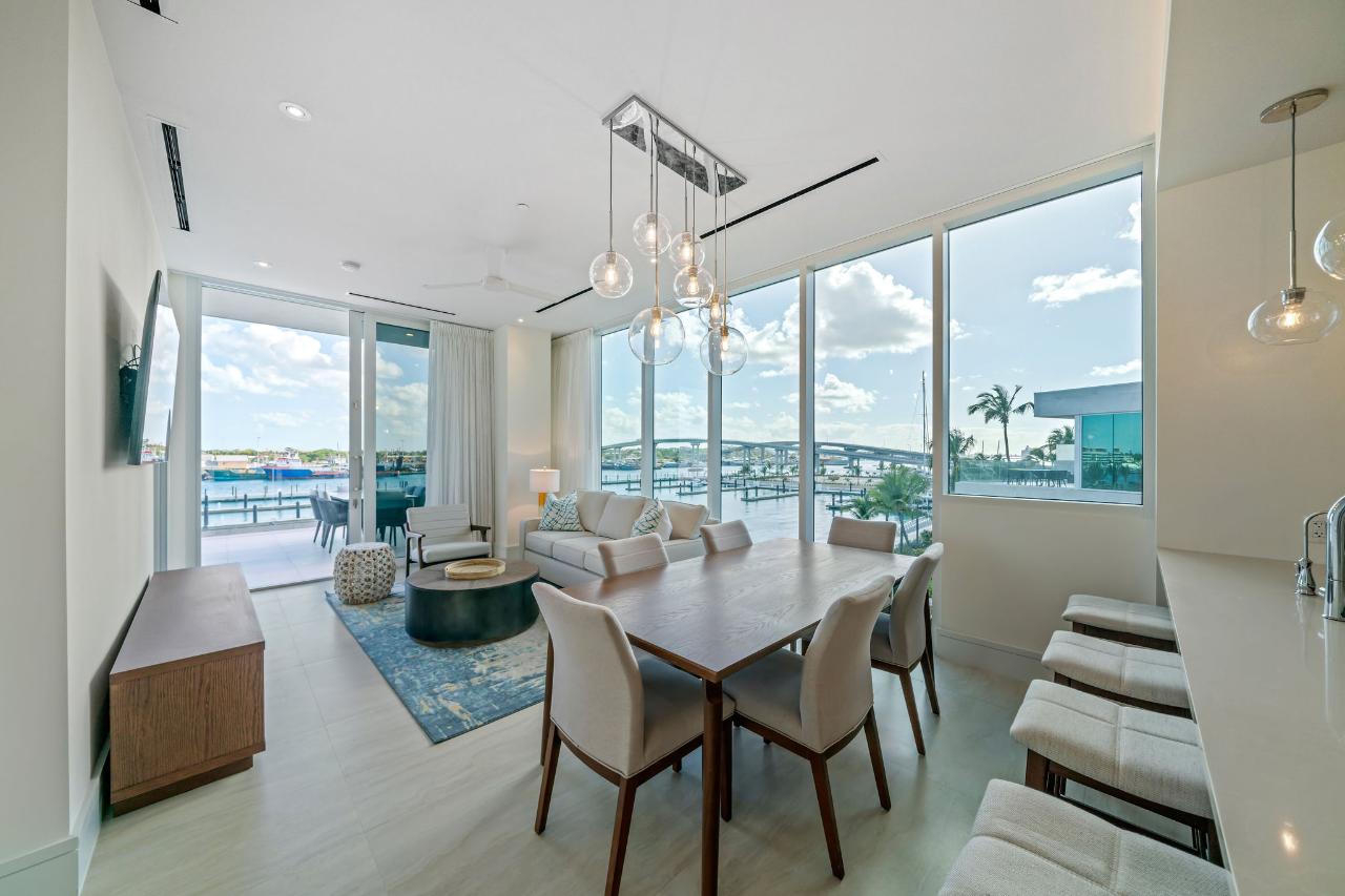 Experience elevated island living in this stunning 2-bedroom, 2-bathroom corner penthouse suite at Sterling Commons, located within the exclusive Paradise Landing community on Paradise Island. From its expansive private balcony and open-concept living space, enjoy panoramic vistas of the Hurricane Hole Superyacht Marina, Nassau Harbour, and gorgeous sunset views that paint the sky each evening. This beautifully furnished penthouse blends sleek contemporary design with relaxed island charm. The residence features high-end appliances, quartz countertops, hurricane-rated doors, central air conditioning, in-unit laundry, and a fully equipped kitchen complete with dishware and linens. Floor-to-ceiling glass doors flood the living space with natural light and showcase the breathtaking waterfront views. Residents of Sterling Commons enjoy access to outstanding on-site amenities, including a resort-style pool, fully equipped gym, gourmet restaurant, and grocery storeâall within the community. Paradise Landing also offers 24-hour security, controlled access, assigned tenant parking