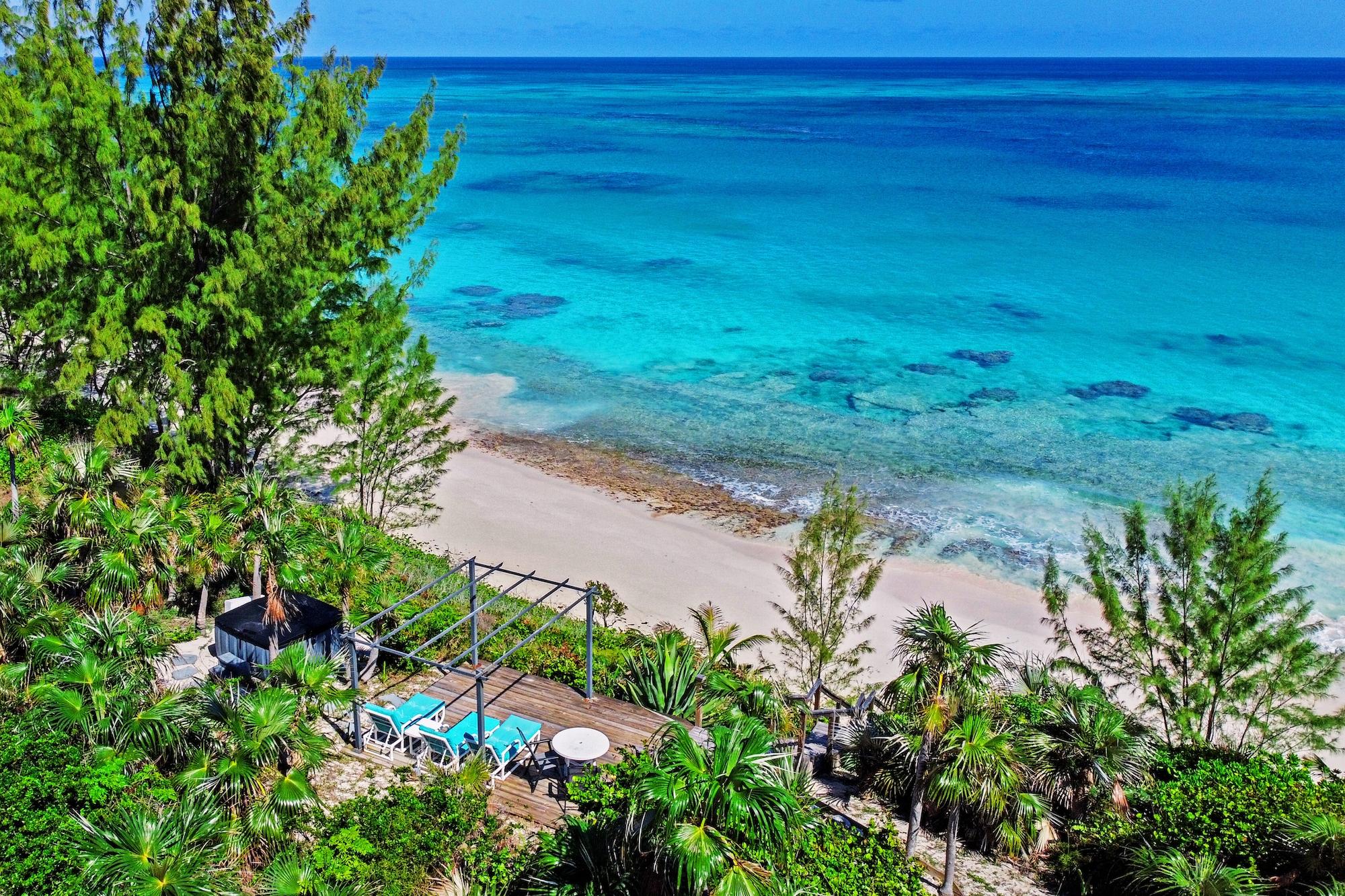 Welcome to Trident Estate, a luxurious beachfront retreat situated on the iconic pink sands of Poponi Beach, ranked among the best in the Bahamas. Designed by Ray Nathaniels, a protégé of Frank Lloyd Wright, this modern estate features a four-bedroom, four-and-a-half-bath main house and a two-bedroom, two-bath guest house, nestled within 3 private acres of lush tropical gardens. Offered fully furnished, this turnkey beachfront property features 450 feet of private beachfront and is elevated 30 feet above sea level, providing unparalleled privacy and breathtaking ocean views.